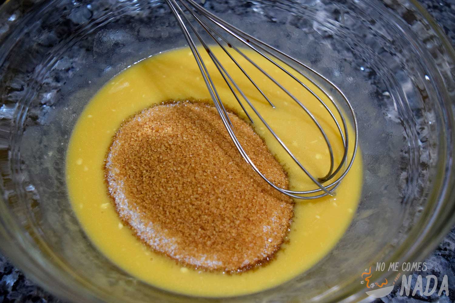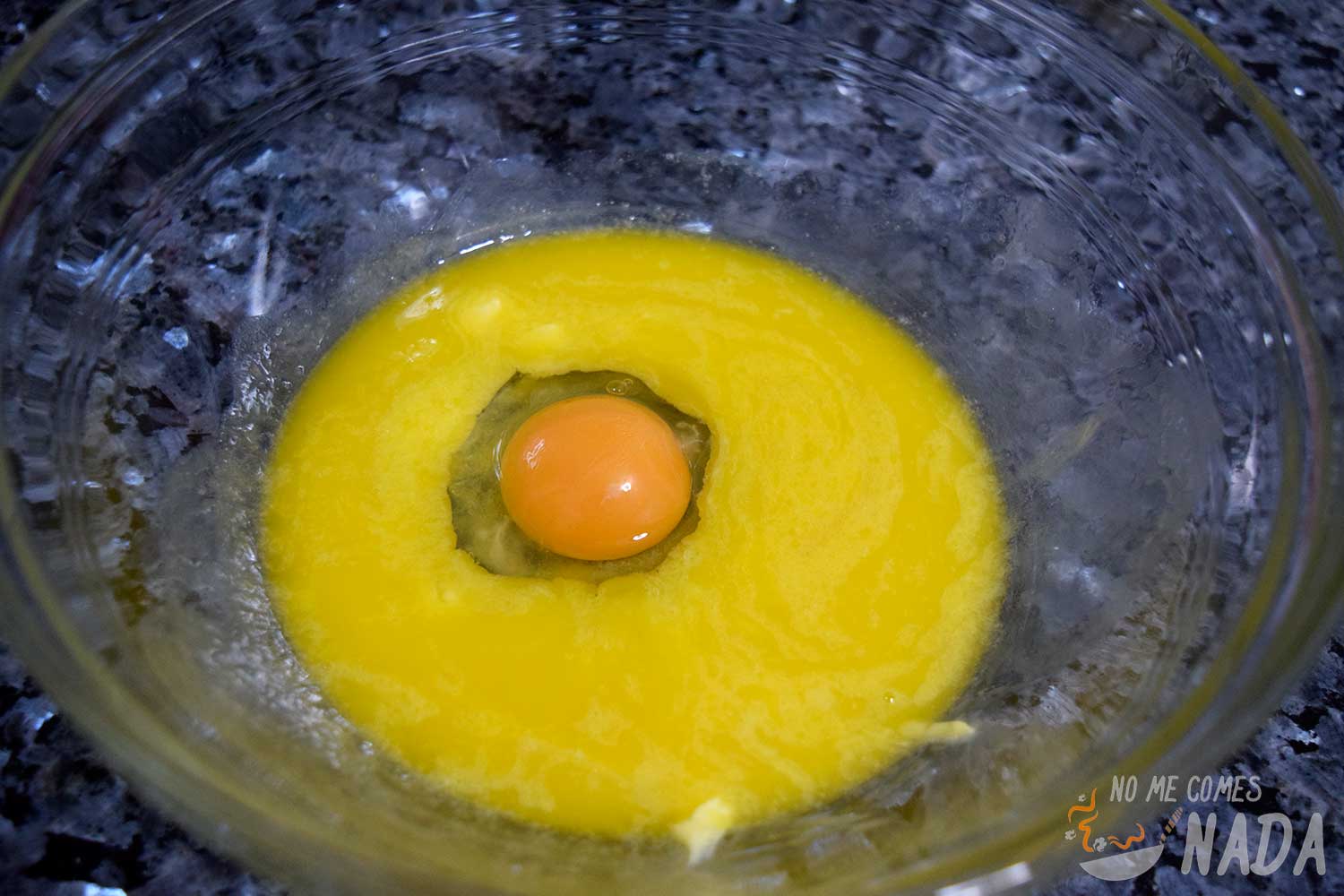 Derretimos la mantequilla en el microondas, poniéndola en intervalos de pocos segundos, lo justo para que este derretida sin que se caliente en exceso. Vertemos la mantequilla en un bol amplio y añadimos el huevo. Con unas varillas (con unas manuales será suficiente), mezclamos hasta que estén totalmente integrados. Agregamos la mezcla de ambos azúcares y volvemos a mezclar con las varillas, de nuevo hasta que el azúcar esté totalmente integrado en la mezcla.