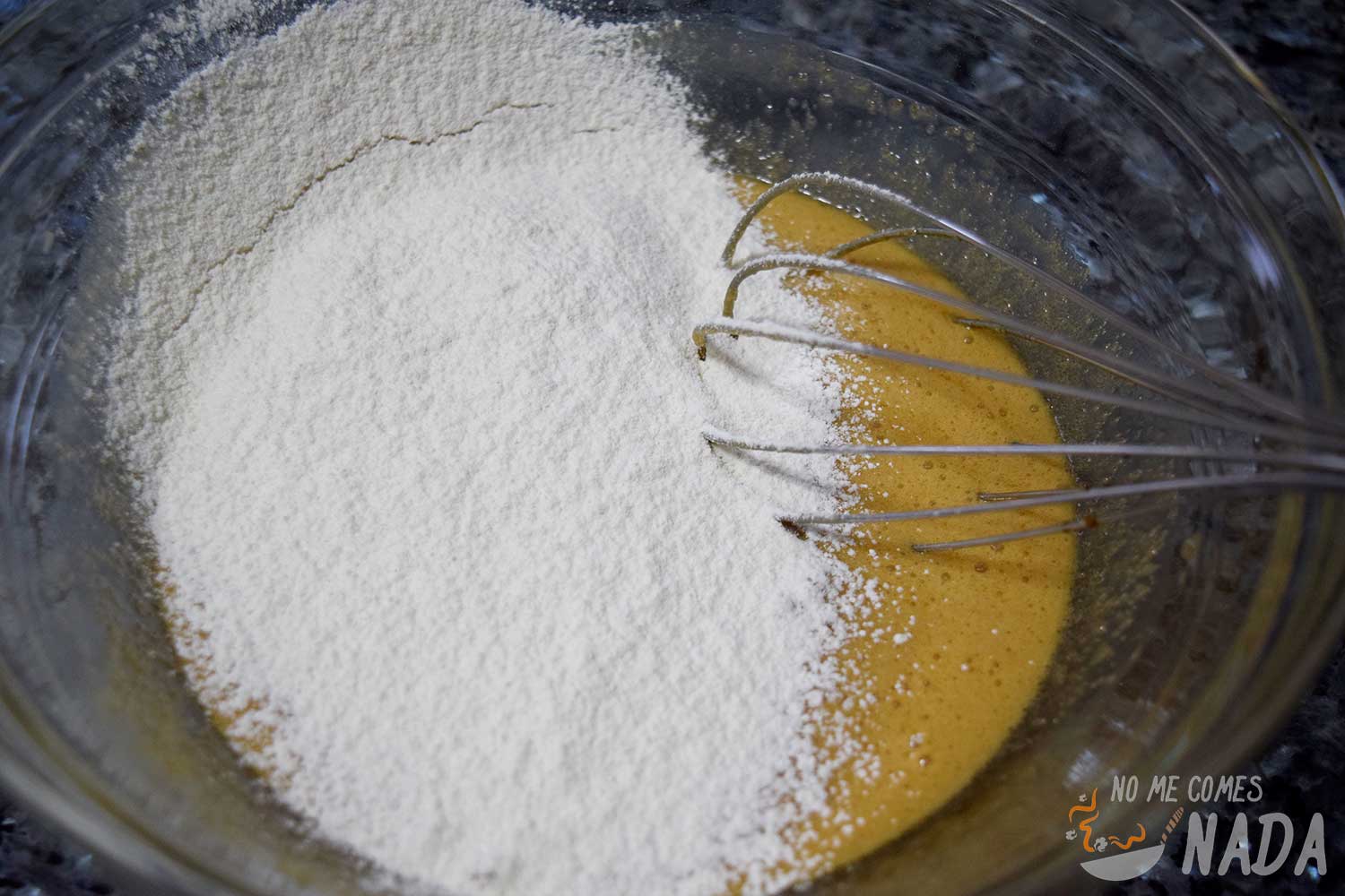 Juntamos la harina con el bicarbonato y lo añadimos en el bol en 3 veces, tamizando la mezcla para evitar que la harina forme grumos. Cada vez que agreguemos harina, repetimos el proceso de remover con las varillas hasta que se integre todo en la masa.