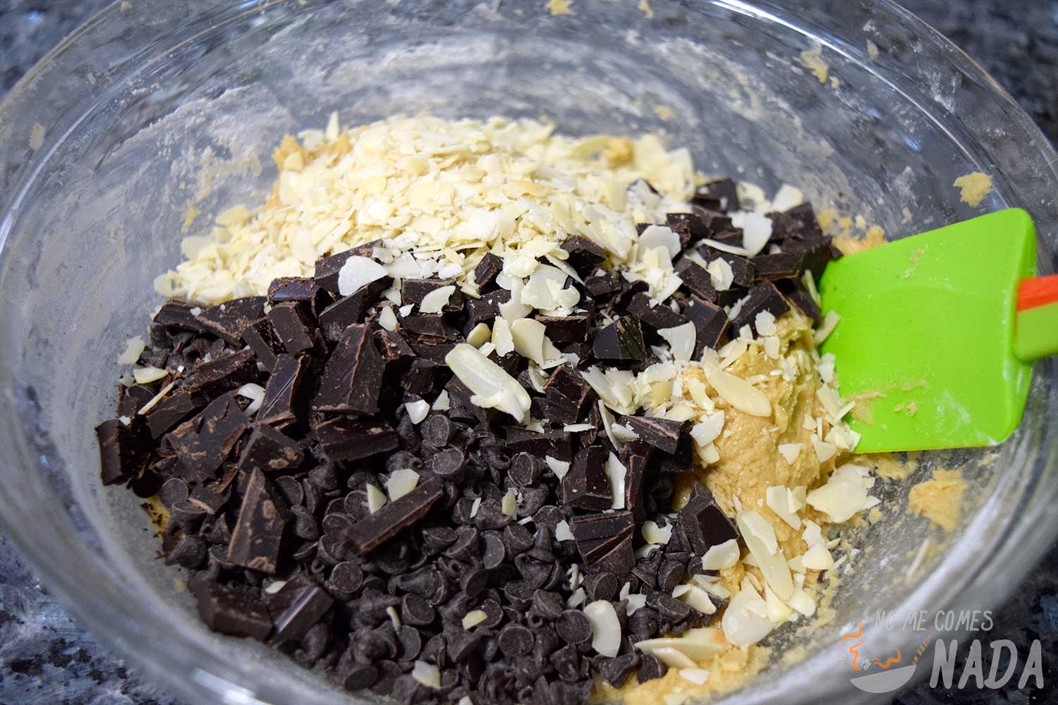 Para el tema del chocolate, podéis usarlo de la forma que más os guste. En mi caso añadí la mitad como gotas de chocolate (tenía un paquete en la despensa) y la otra mitad chocolate negro 85% troceado con el cuchillo. Así que podéis elegir lo que más os guste (negro, con leche, pepitas gotas, etc.). Simplemente verted todo el chocolate en el bol y, con ayuda de una espátula, mezclarlo hasta que esté bien repartido por toda la masa.