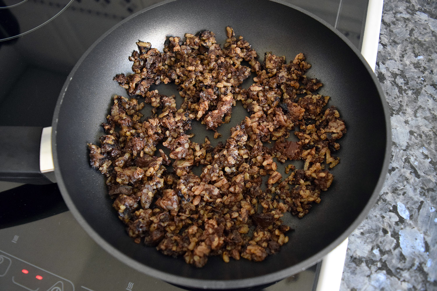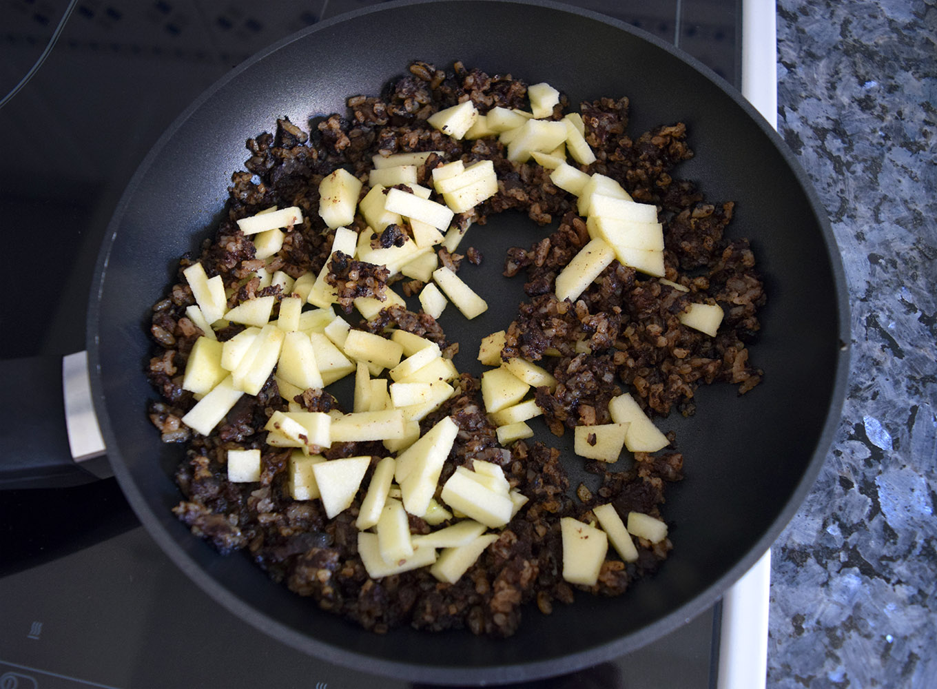 Ponemos una sartén con un chorrito de aceite a fuego medio-alto y echamos la morcilla desmenuzada. La salteamos un poco hasta que veamos que se dora un poco. Luego echamos la manzana lo más troceada que podamos y bajamos la potencia del fuego, dejando pochar la manzana hasta que veamos que empieza a ablandarse.