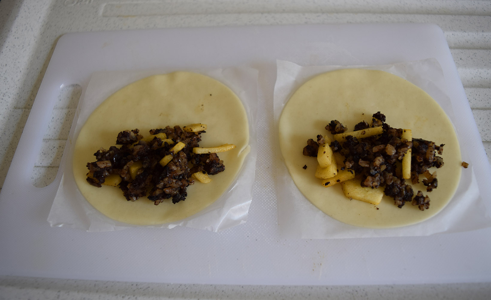 Una vez tengamos el relleno listo, pasamos a montar las empanadillas. Yo suelo doblarlas por la mitad al estilo tradicional pero he visto en más de un sitio que también se pueden doblar en triángulo (llevando al centro 3 bordes) aunque nunca lo he probado de esta forma. Para la forma tradicional de empanadilla, ponemos un poco de relleno en el centro y doblamos la masa por la mitad, aplastando los bordes con un tenedor para que quede bien cerrado. La cantidad de relleno es un poco a ojo, yo intento que queden bastante rellenas y a veces me tengo que pelear un poco al cerrarlas para que no se partan…