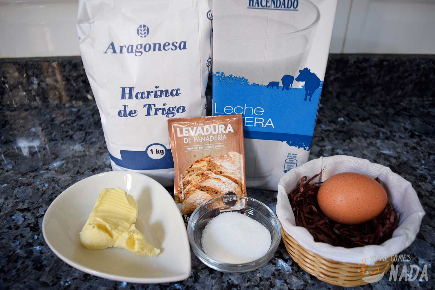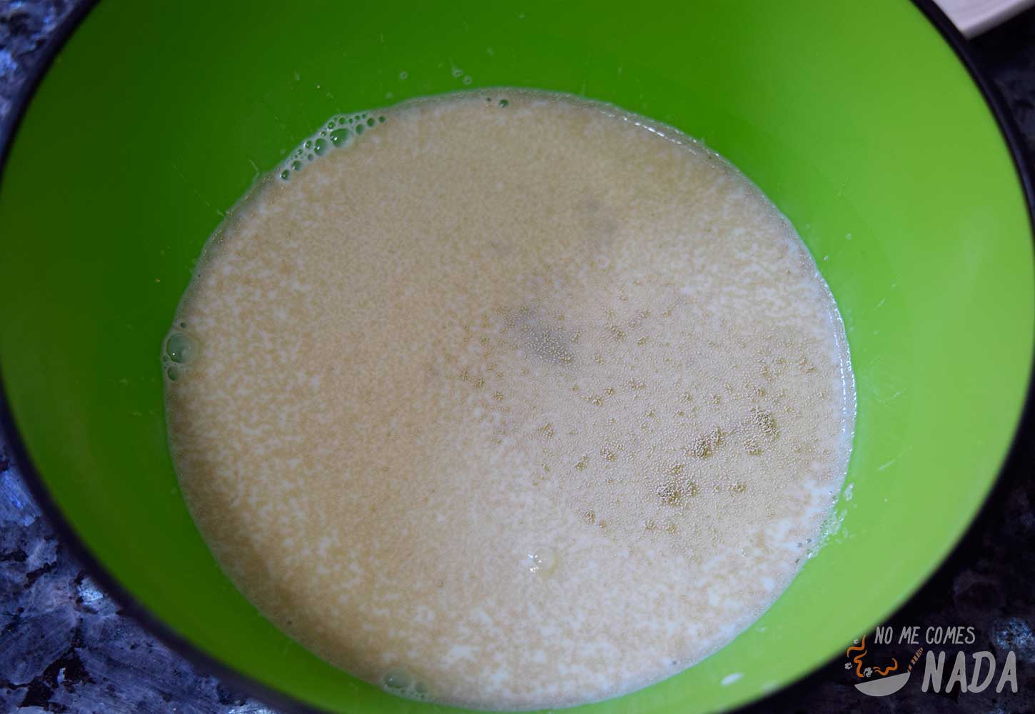 Empezamos mezclando la levadura y el azúcar con la leche tibia hasta disolverlos completamente. Dejamos reposar 10 minutos para que la levadura empiece a hacer efecto.