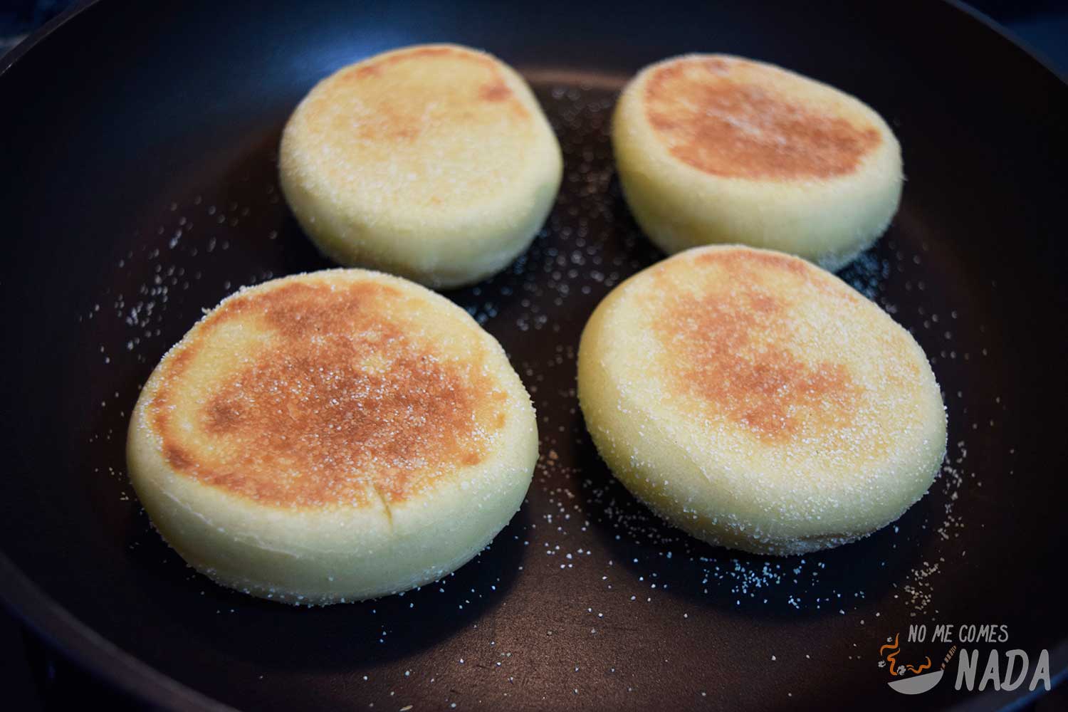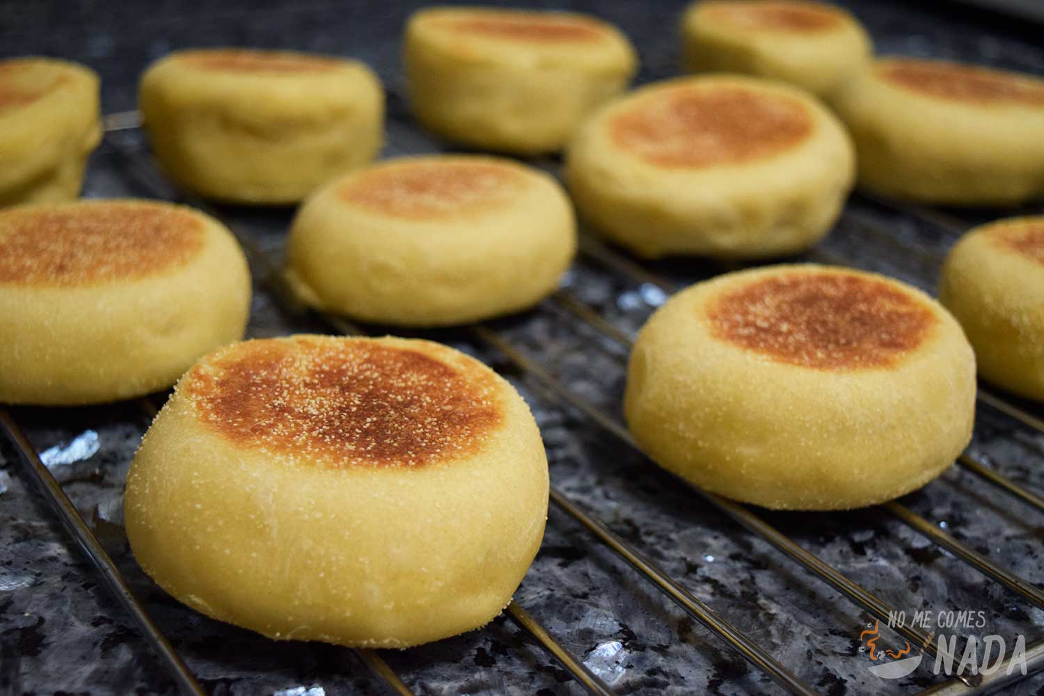 Pasado ese tiempo, ponemos una sartén a fuego medio-bajo (no hace falta nada de aceite o mantequilla) y cocinamos nuestros english muffins. Simplemente los hacemos 6-8 minutos por cada lado, tapando la sartén para que acumule calor, se hagan mejor y no se queden crudos por dentro. Según estén hechos, los dejamos enfriar sobre una rejilla.