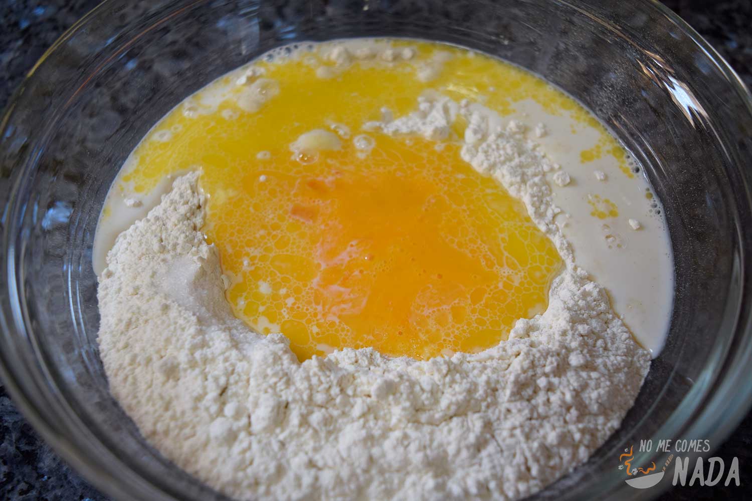 Pasado ese tiempo, vertemos la harina junto con la sal en un bol amplio y hacemos un hueco en medio, a modo de volcán. Derretimos la mantequilla en el microondas en tandas de pocos segundos, lo justo para que se derrita, no queremos que se caliente mucho. Incorporamos la mantequilla derretida, el huevo batido y la mezcla de levadura al bol con la harina.