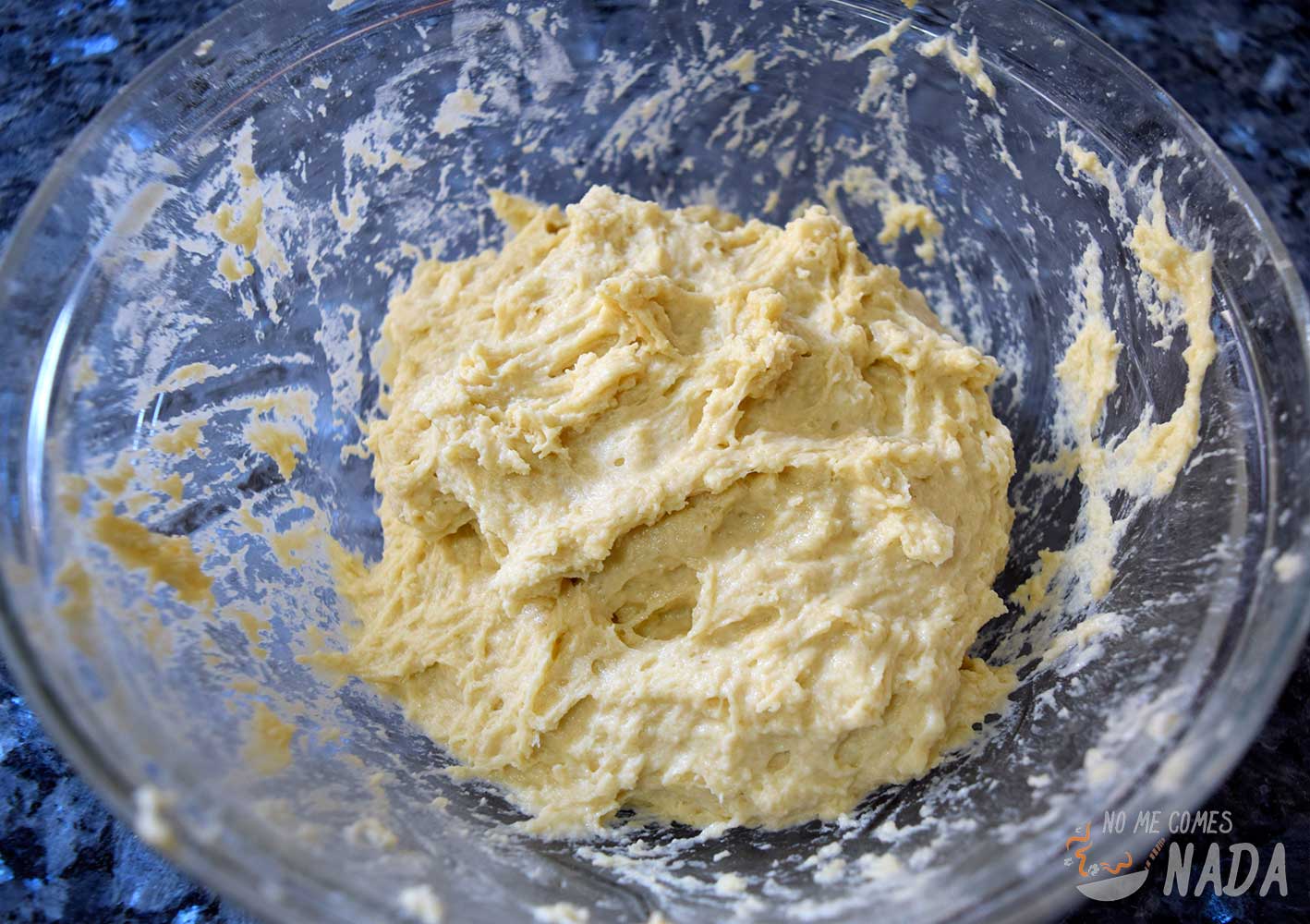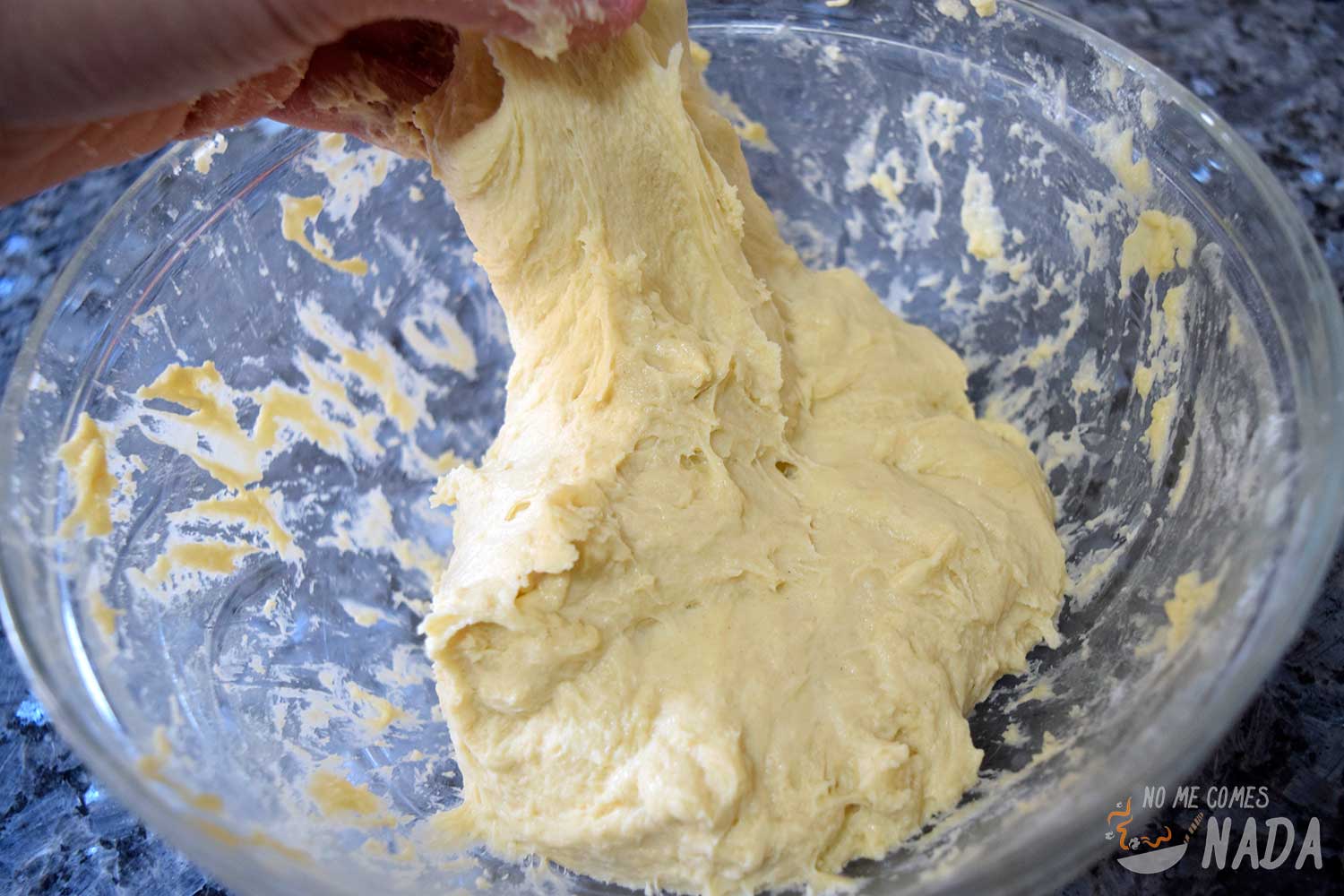 Y ahora la parte más divertida, nos remangamos bien y… ¡manos a la masa! La cosa es fácil, simplemente mezclaremos lo justo para que todo esté bien integrado, todavía no vamos a amasar nada. Obtendremos una masa muy pegajosa, que os va a dejar las manos como si fuerais niños pequeños jugando con plastilina, pero no os asustéis porque la masa es así, no hace falta que añadáis más harina. Simplemente, intentad despegaros de las manos la mayor cantidad de masa posible y la juntáis con el resto en el bol.