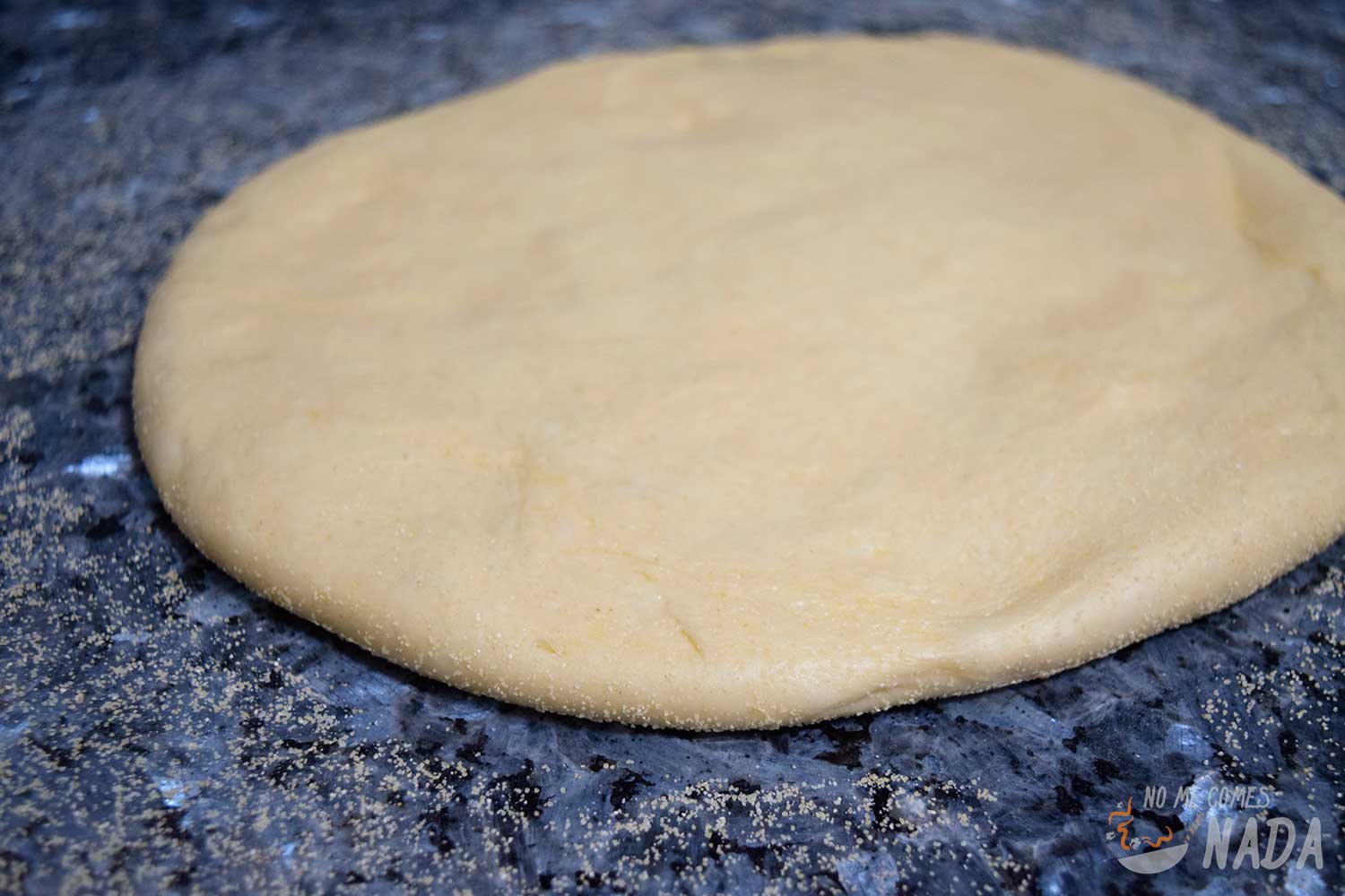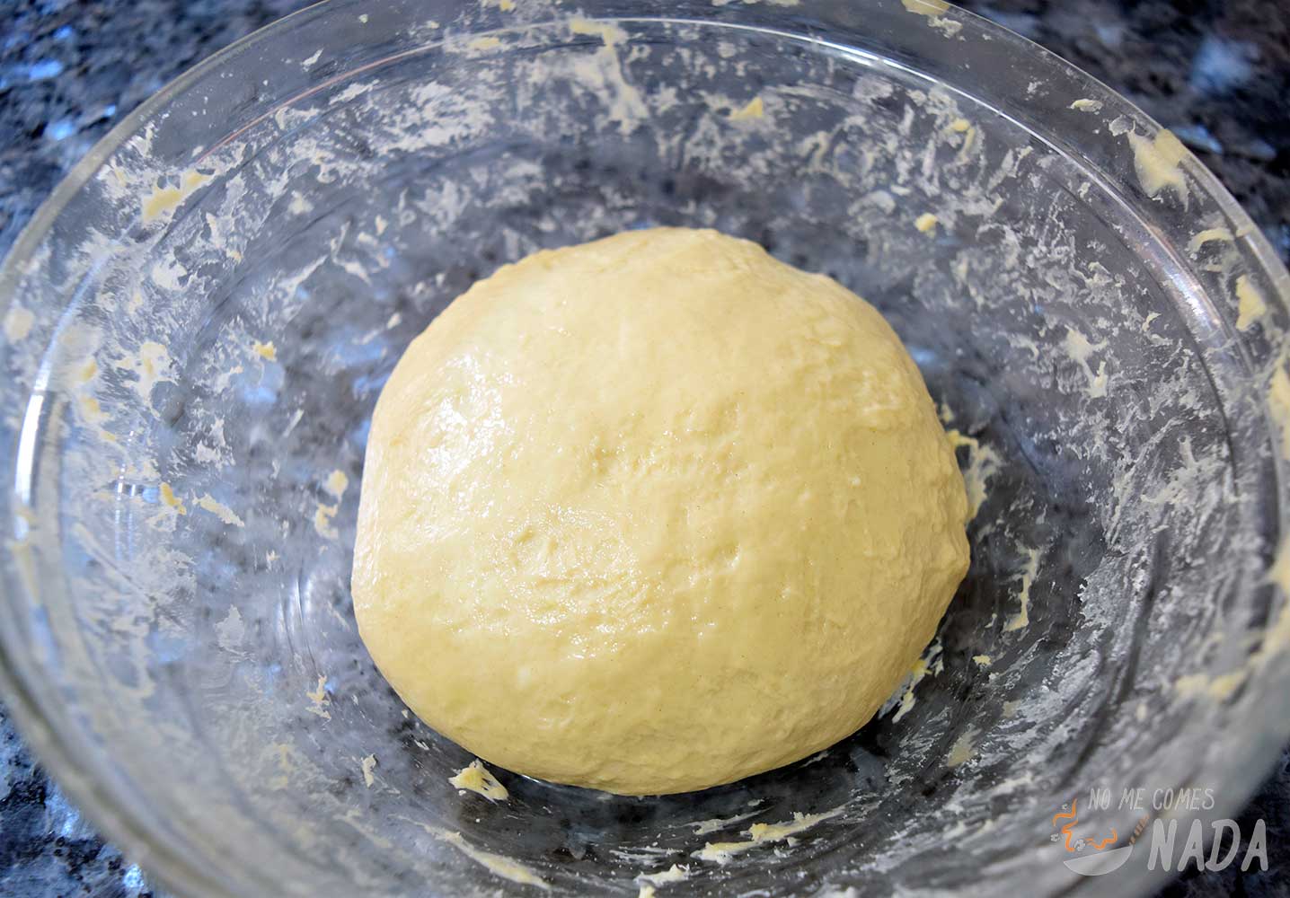 Os explico más detalladamente el amasado. La primera vez, no hace falta ni que saquéis la masa del bol, simplemente estiramos un poco de un lado, lo llevamos al centro y vamos repitiendo por todo el borde de la masa (como si estuviéramos haciendo un saquito con una tela). A partir del segundo amasado, impregnamos la mesa de trabajo con un poco de aceite, pasamos la masa a la misma, nos impregnamos también las manos con aceite y amasamos de la misma manera. Repetimos el proceso unas 3-4 veces y, finalmente, hacemos una bola con la masa y la dejamos en el bol engrasado ligeramente con aceite y tapada con un paño hasta que doble su volumen (dependiendo de la temperatura podrá tardar de 2 a 4 horas).