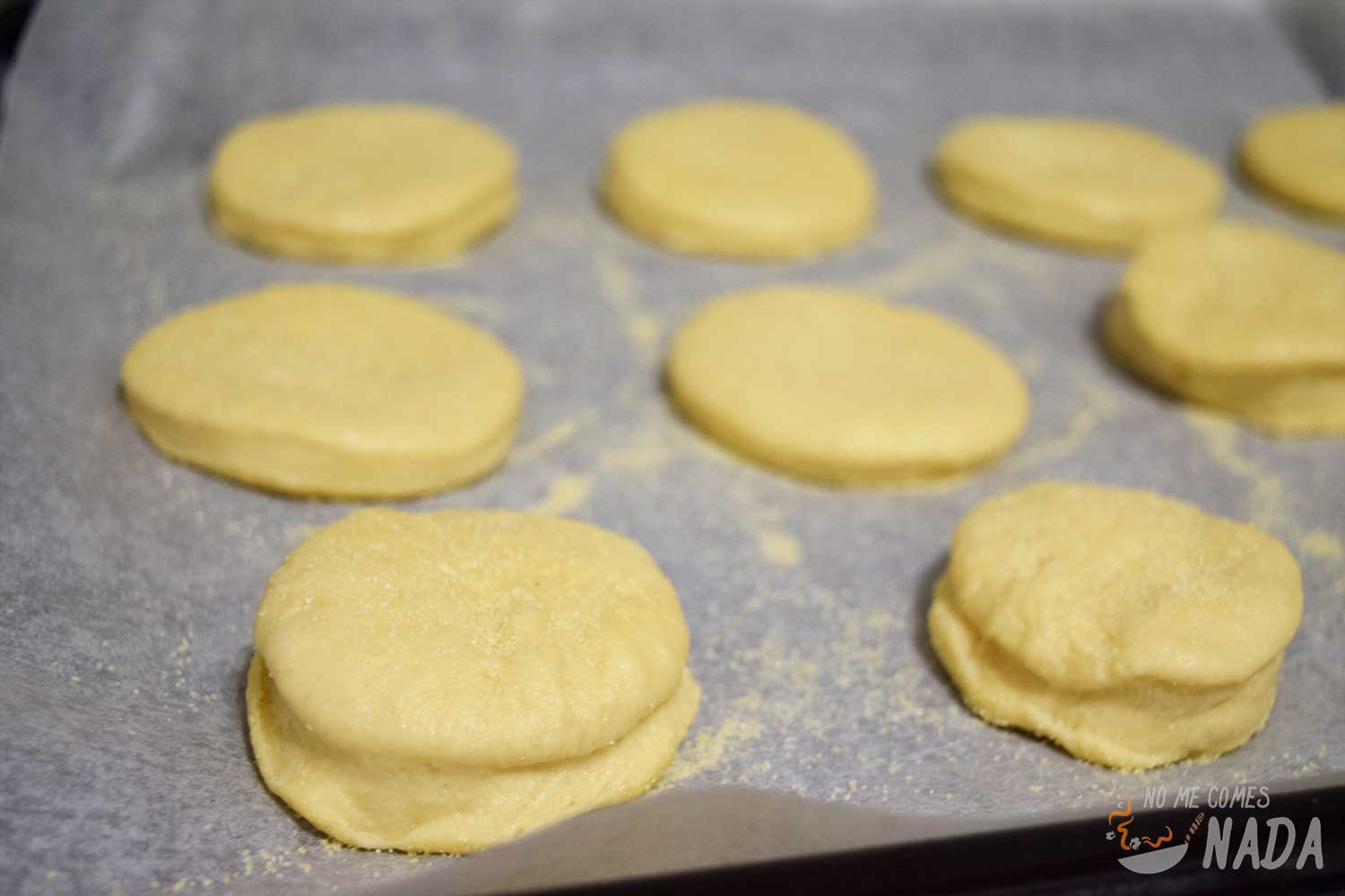Cuando la masa esté lista, espolvoreamos abundante sémola de trigo duro sobre la mesa de trabajo y echamos la masa encima. Estiraremos la masa con las manos, apretando suavemente para desgasificarla hasta que tenga un dedo de grosor más o menos (1,5 cm aprox.). Con un cortapastas/cortagalletas/vaso de unos 7-8 cm de diámetro, vamos cortando los panecillos y los vamos poniendo en la bandeja del horno, sobre un papel vegetal donde habremos espolvoreado más sémola de trigo duro. Con la masa sobrante, hacemos una bola y volvemos a estirar y cortar. Espolvoreamos un poco de sémola de trigo por encima de los panecillos también y los dejamos tapados con un paño durante unos 45 minutos (no hace falta que doblen su volumen).