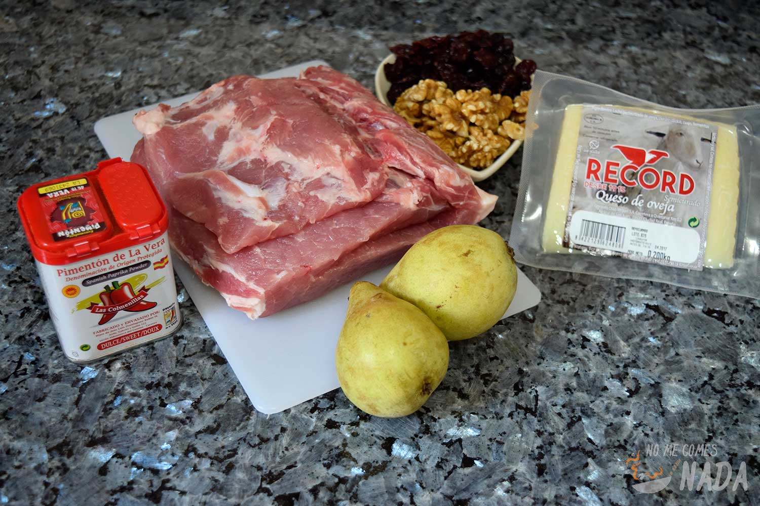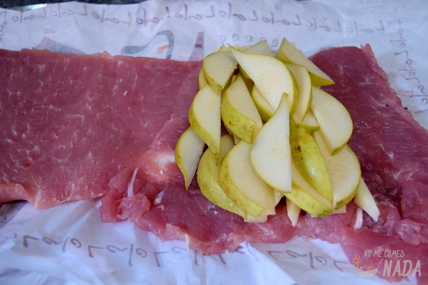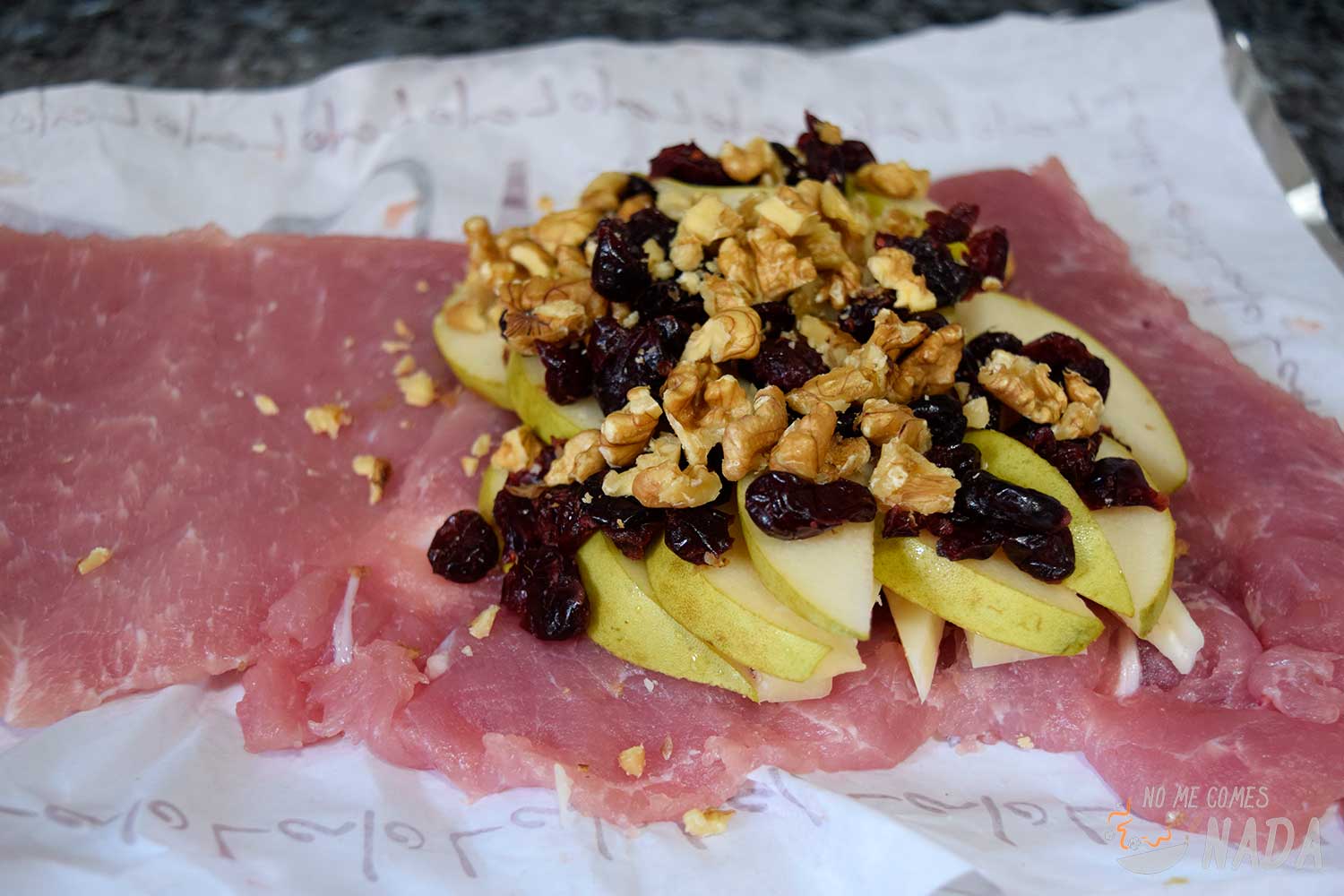 Extendemos el lomo abierto sobre una tabla de cortar o sobre la encimera, lo cubrimos con film transparente y lo golpeamos un poco con un mortero, maza o rodillo para ablandarlo un poco. Salpimentamos la parte interior del lomo y empezamos a rellenarlo. Casi en un extremo del lomo, pondremos el queso cortado a tiras, la pera (lavada y sin pelar) cortada en finas cuñas y repartimos un puñado de nueces troceadas y de arándanos. Enrollamos el lomo sobre el lado largo del rectángulo, intentando que no se nos salgan mucho los ingredientes por los lados ![]()