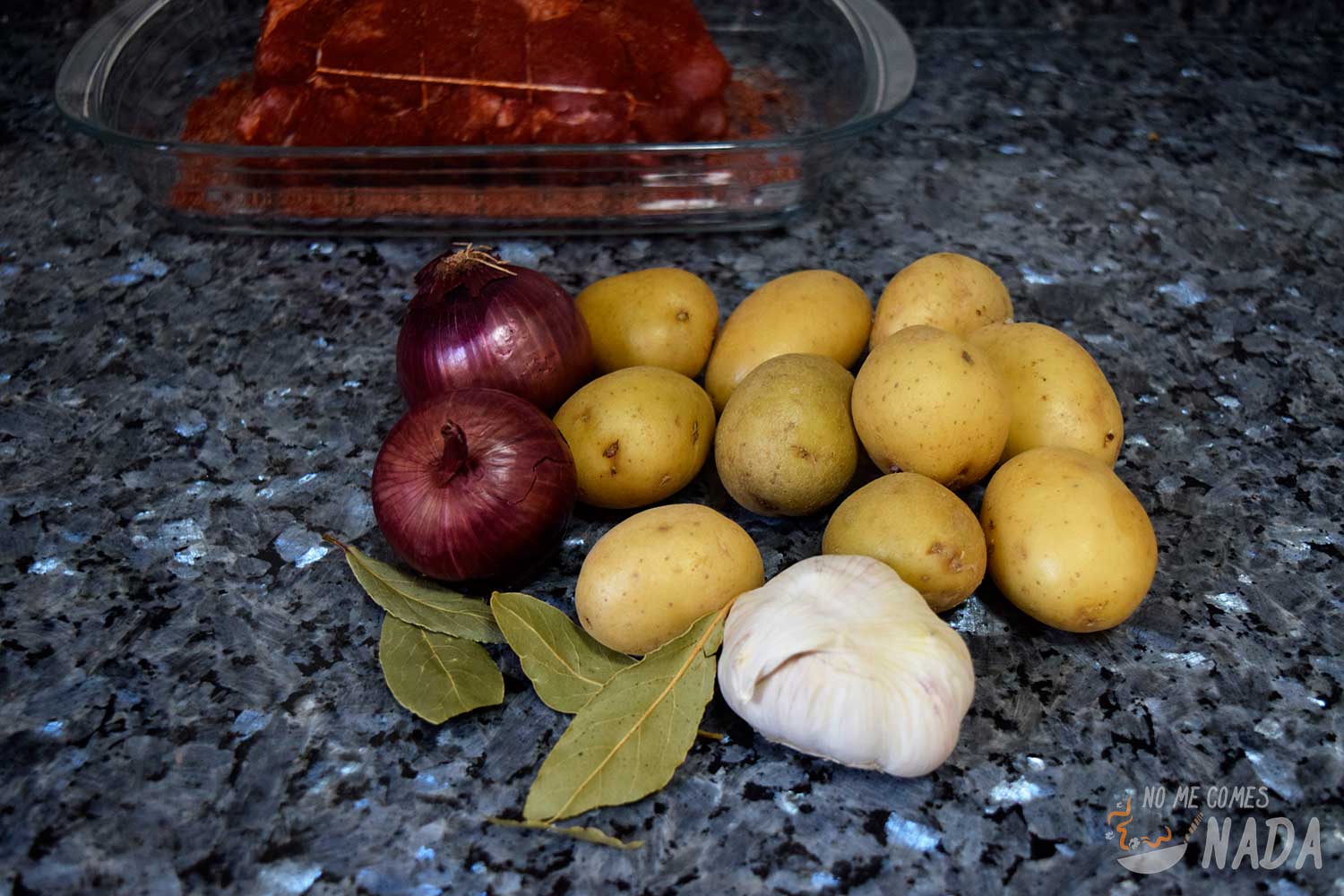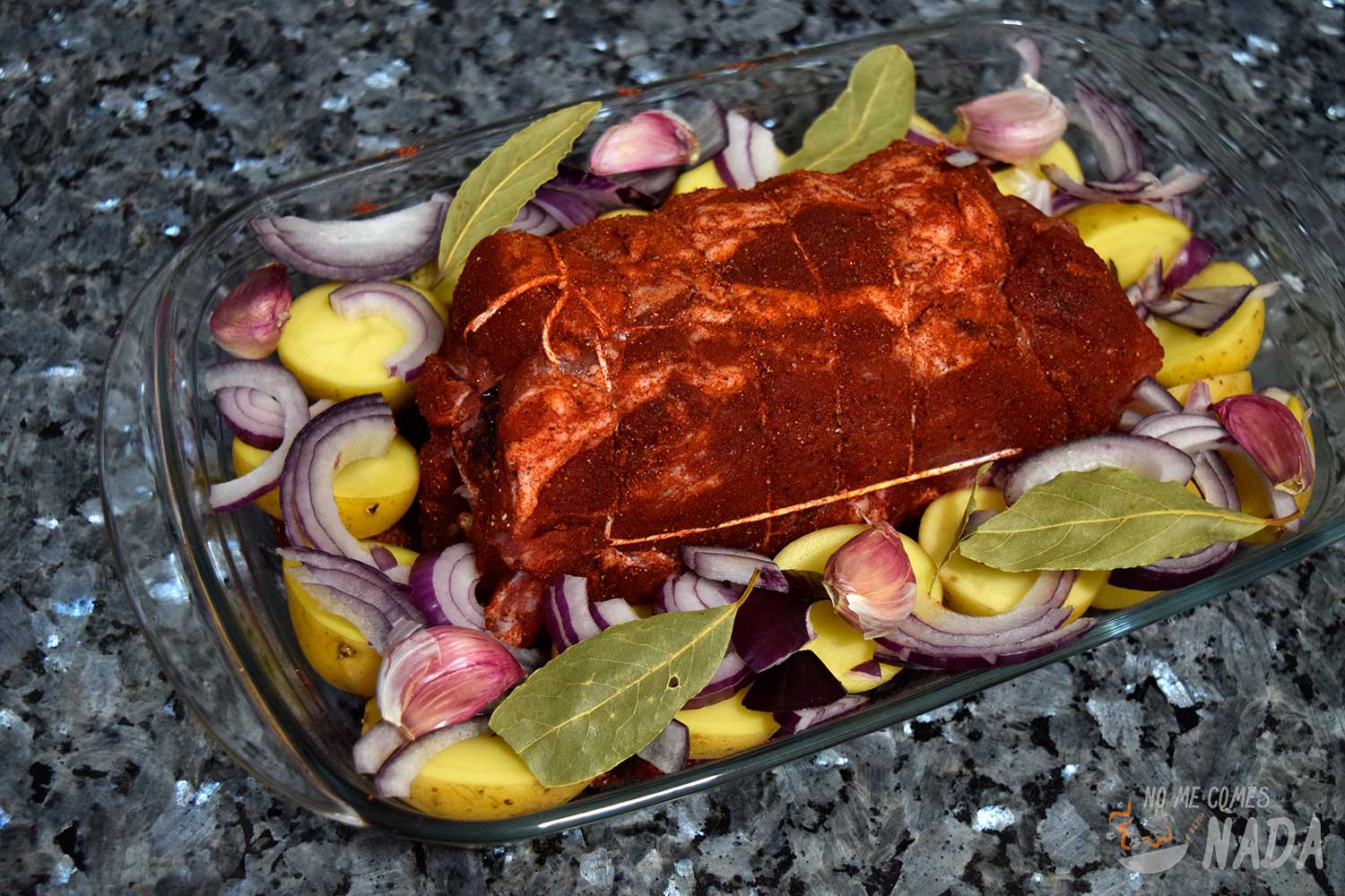 Por otro lado, lavamos las patatas para quitarle toda la tierra y las cortamos por la mitad. La cebolla morada la cortaremos en juliana. Ponemos las patatas y la cebolla en la fuente alrededor del lomo, añadimos los ajos machacados y unas hojas de laurel. Salpimentamos y regamos con un poco de aceite de oliva virgen extra.