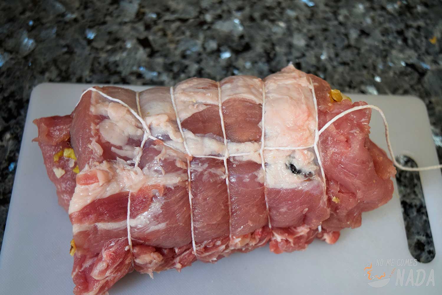 Ahora llega la parte «complicada»: atar/bridar el lomo. Si no habéis atado nunca un lomo, no os asustéis, parece más de lo que es. Os dejo un video para que os hagáis una idea de cómo atarlo bien. Yo pedí la cuerda para atarlo en la misma carnicería y muy amablemente me dieron un buen trozo que me daba de sobra.