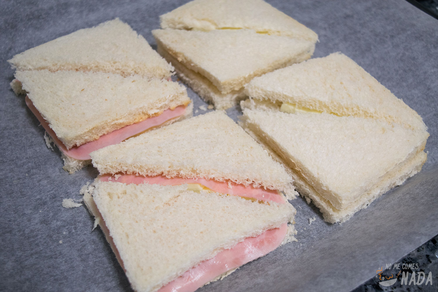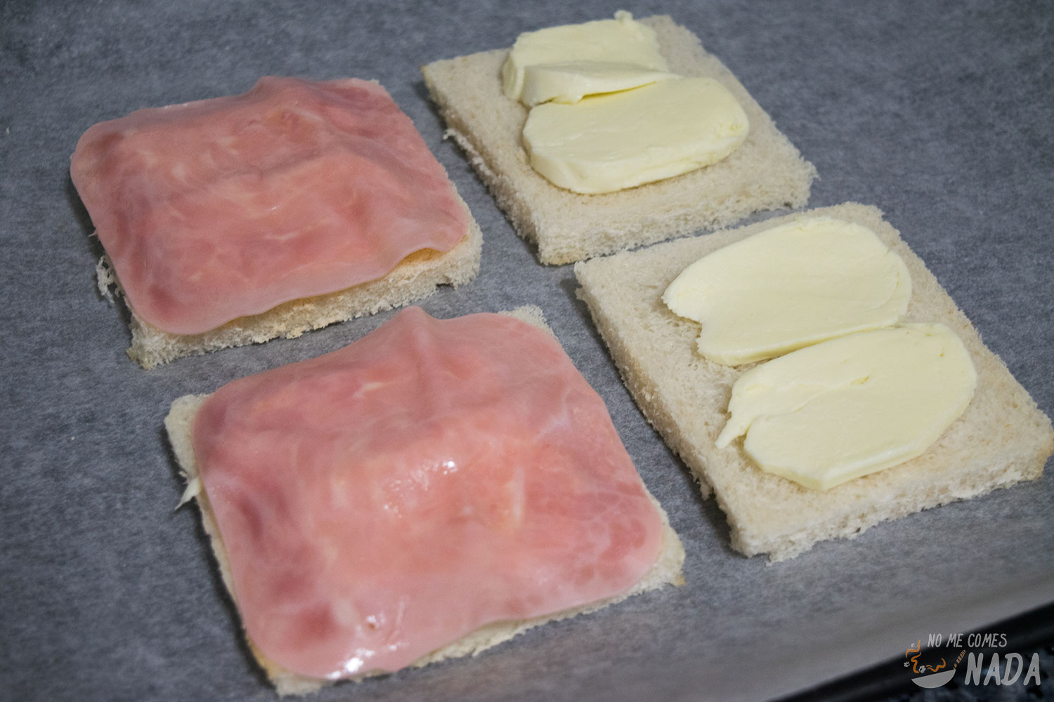 Montamos los sándwiches rellenándolos con una capa de rodajas de mozzarella y una capa de jamón de york. Si queréis también podéis dejar el sándwich solamente con mozzarella, pero, en ese caso, deberá ser una buena mozzarella para darle sabor sino quedará muy soso.