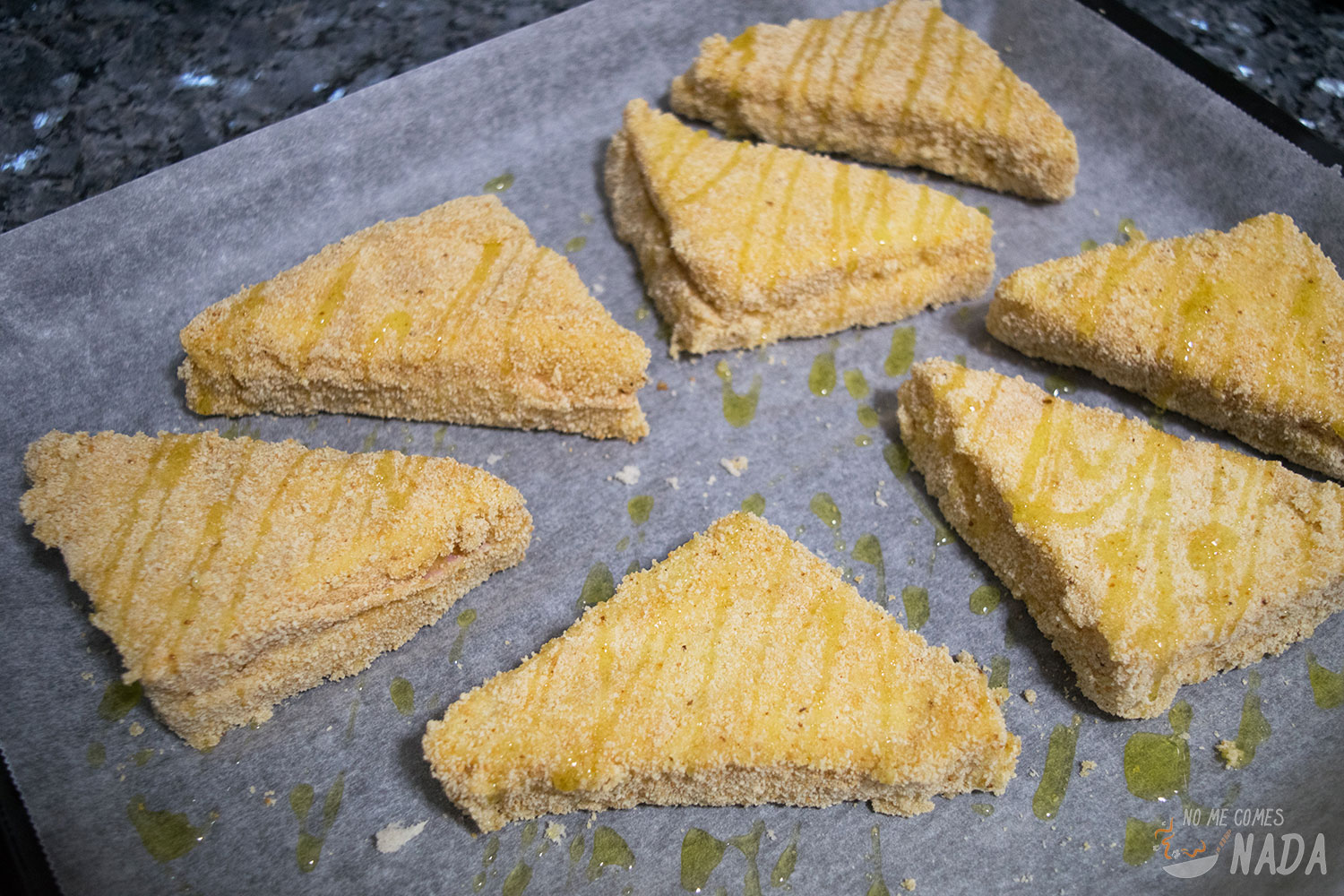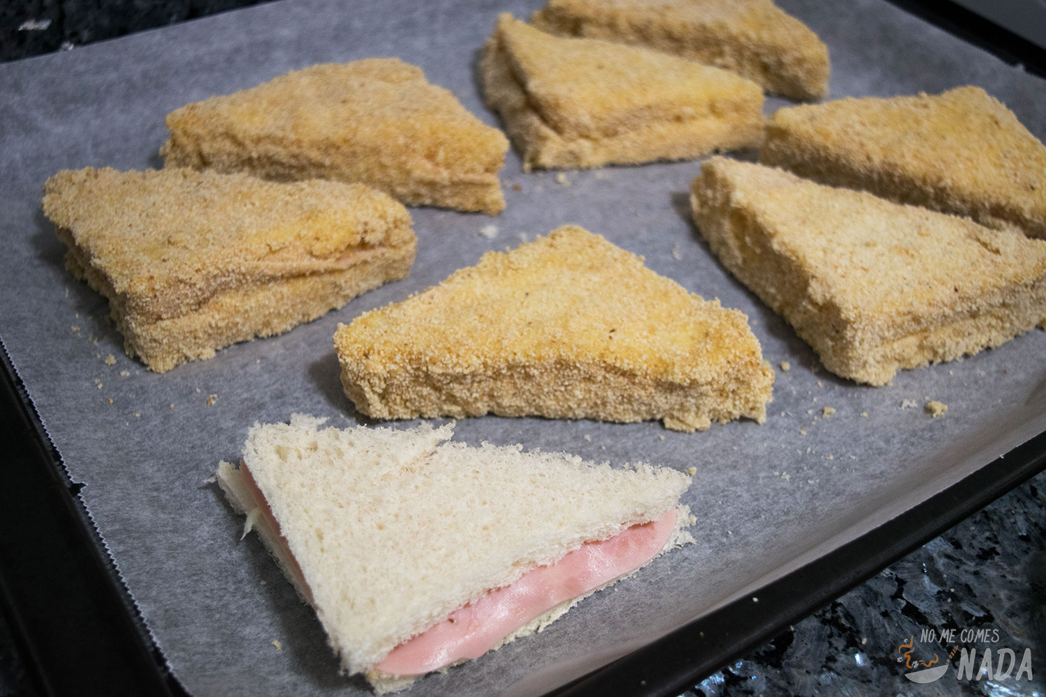 Cortamos los sándwiches en triángulos o en 4 cuadrados si queréis algo más en plan aperitivo/canapé, y los pasamos por huevo batido y pan rallado. Básicamente empanamos el pan, sí, es una técnica peculiar ![]()