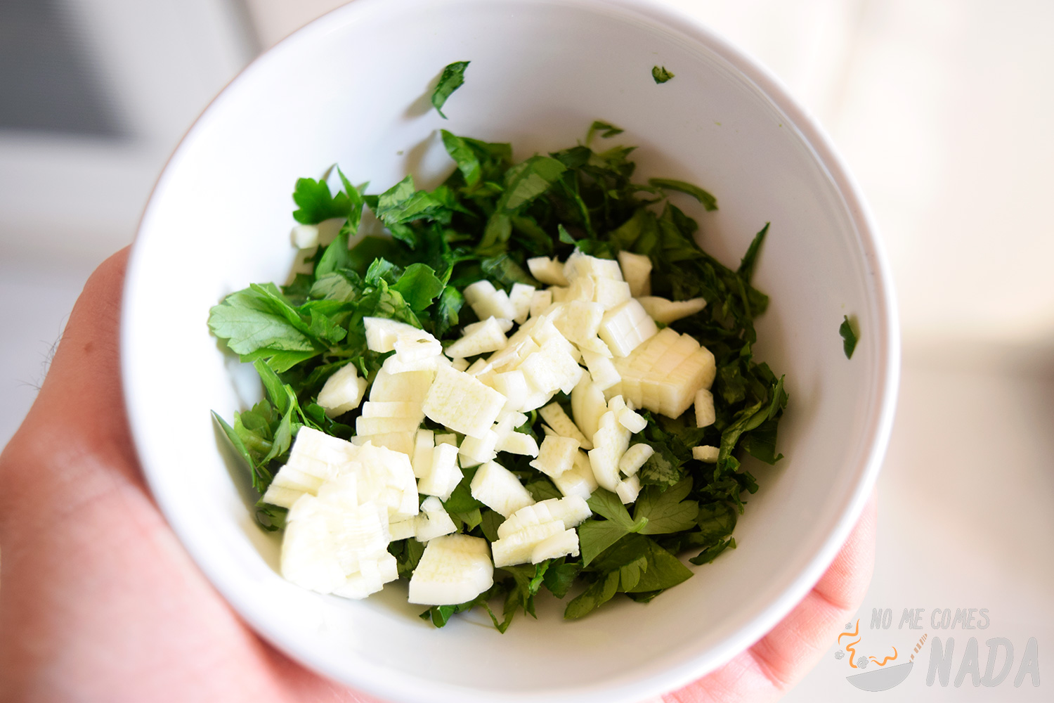 En un pequeño cuenco ponemos la mantequilla a temperatura ambiente junto con el ajo y el perejil picados. Mezclamos hasta que esté todo integrado.