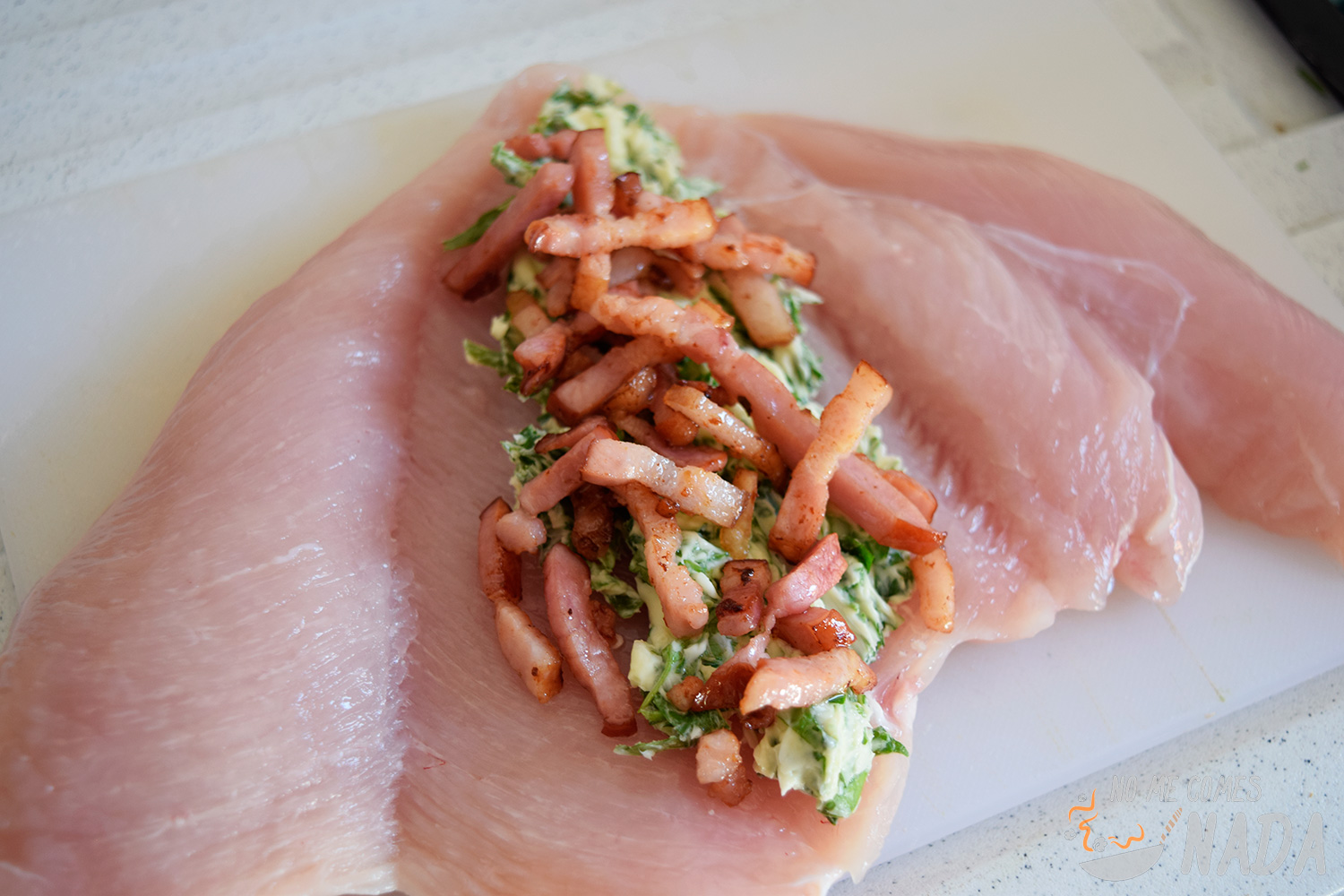 Abrimos las pechugas en libro (en mi caso se lo pedí al carnicero ) y las rellenamos con una capa de la mezcla mantequilla/ajo/perejil y con bacon. Como veis, en ningún momento os he puesto cantidades para que pongáis tanto relleno como prefiráis Cerramos las pechugas, poniendo un palillo para que quede bien sujeta y no se abra.