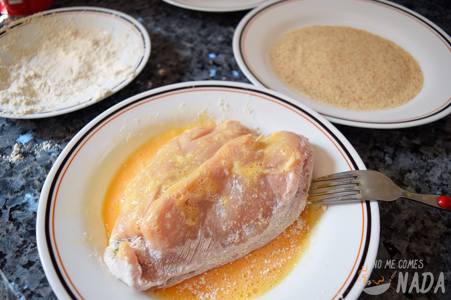 Empanamos las pechugas como se suele hacer, pasándolas por harina, huevo batido y pan rallado.