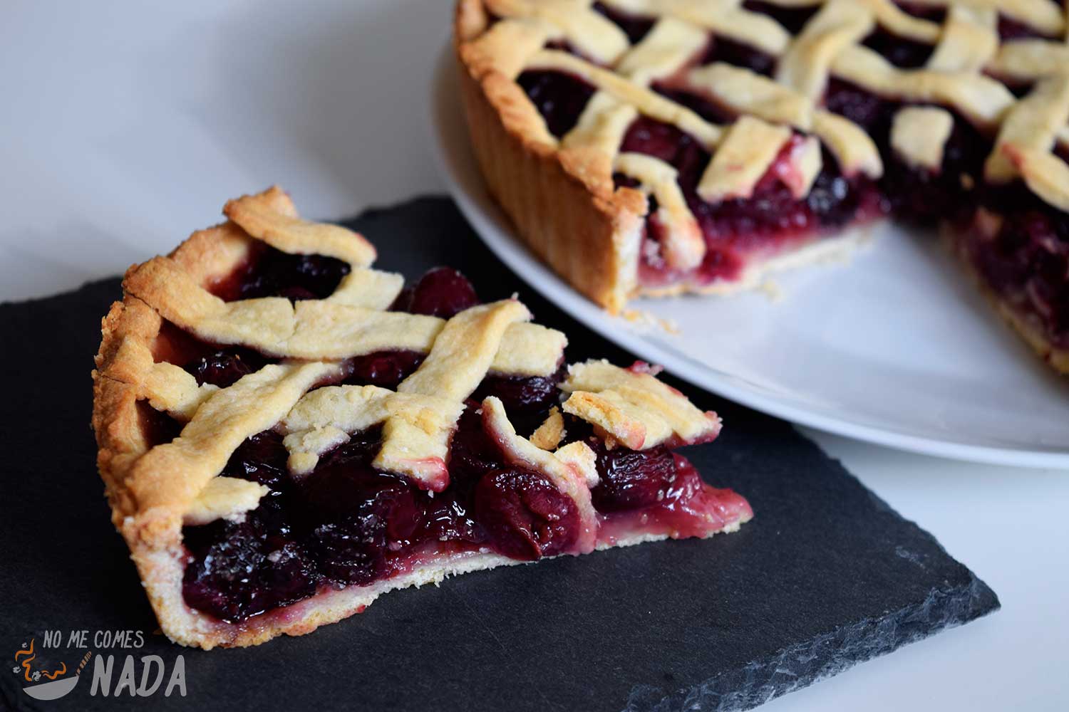 Ya solo nos queda montar todo. Sacamos el molde del congelador, rellenamos la tarta con las cerezas maceradas y, o bien hacemos el enrejado directamente sobre la tarta, o ponemos el enrejado que ya hemos montado fuera.