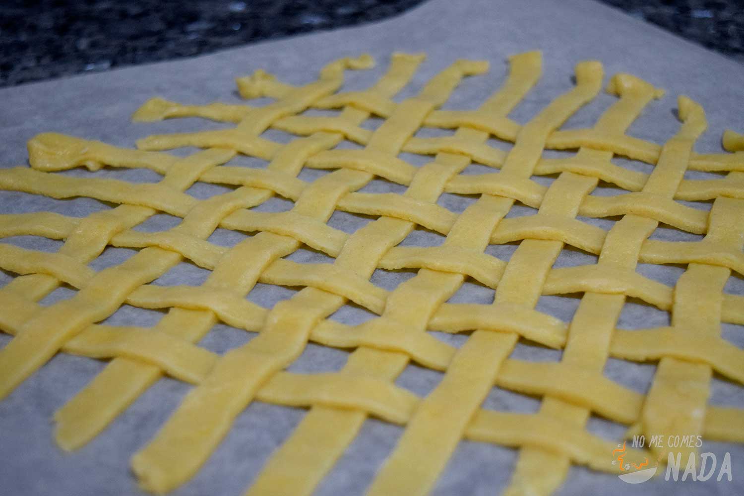 Ahora viene la parte “complicada” que es montar el enrejado. Si no os queréis comer mucho la cabeza, podéis montarlo directamente sobre la tarta poniendo primero una capa de tiras espaciadas y luego la otra capa de forma perpendicular a las anteriores. Es una forma más rápida y sencilla aunque no quedan las tiras entrelazadas y se pierde un pelín de decoración.