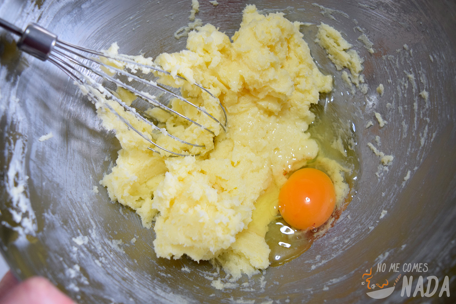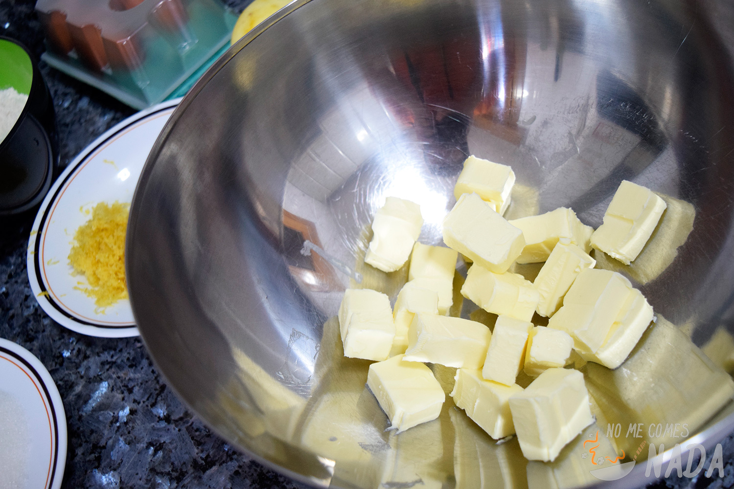 Mientras tanto, vamos preparando la masa de la tarta. En un bol amplio, echamos la mantequilla cortada en dados y la batimos durante 2 minutos, para que se ablande. Añadimos el azúcar y volvemos a batir otros 2 minutos para que se mezcle bien con la mantequilla.