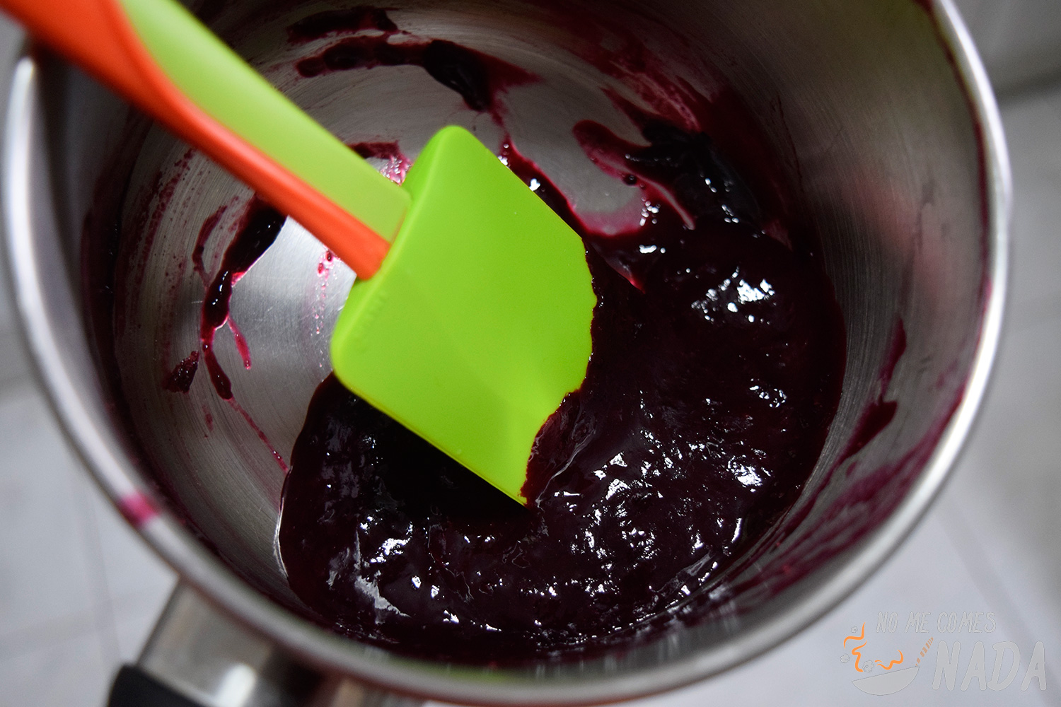 Una vez que tengamos los bizcochos se hayan enfriado lo suficiente, nos tocará preparar la buttercream de arándanos Lo primero será hacer un coulis con los arándanos, que no tiene ninguna complicación. En un cazo vertemos los arándanos junto con el zumo de limón y el agua y lo ponemos a fuego medio hasta que los arándanos empiecen a ablandarse y podamos aplastarlos sin esfuerzo, para que suelten el jugo. Una vez echo esto, trituramos esta mezcla para que no quede ningún trozo de arándano y la seguimos dejando a fuego bajo el tiempo necesario para que se vaya espesando y se forme una especie de puré/jarabe. Dejamos enfriar.