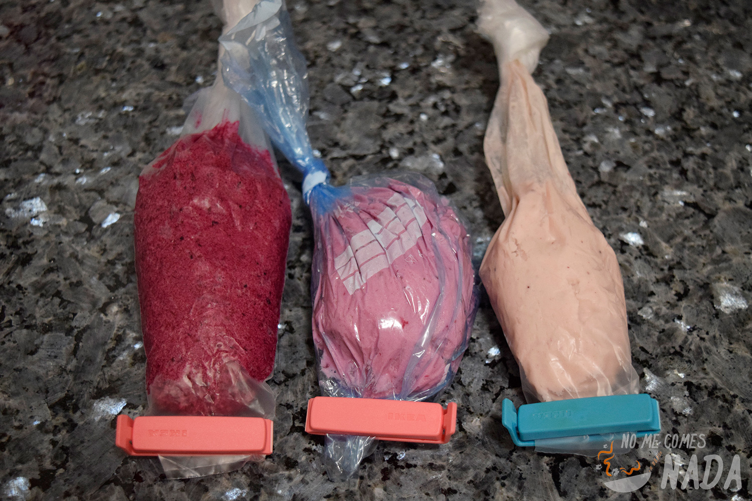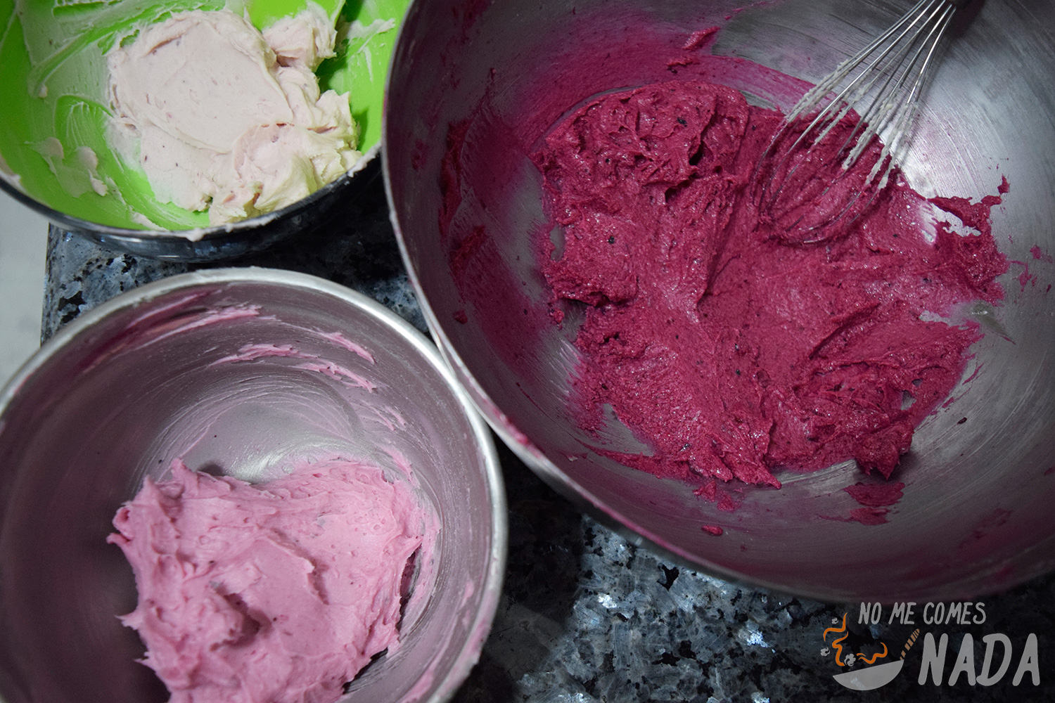 Cogemos 3 boles y dividimos la buttercream en ellos a partes iguales. Repartimos el coulis de arándanos entre los 3 boles, pero no a proporciones iguales, sino repartiendo de menos a más para conseguir una buttercream degradada en 3 tonalidades.