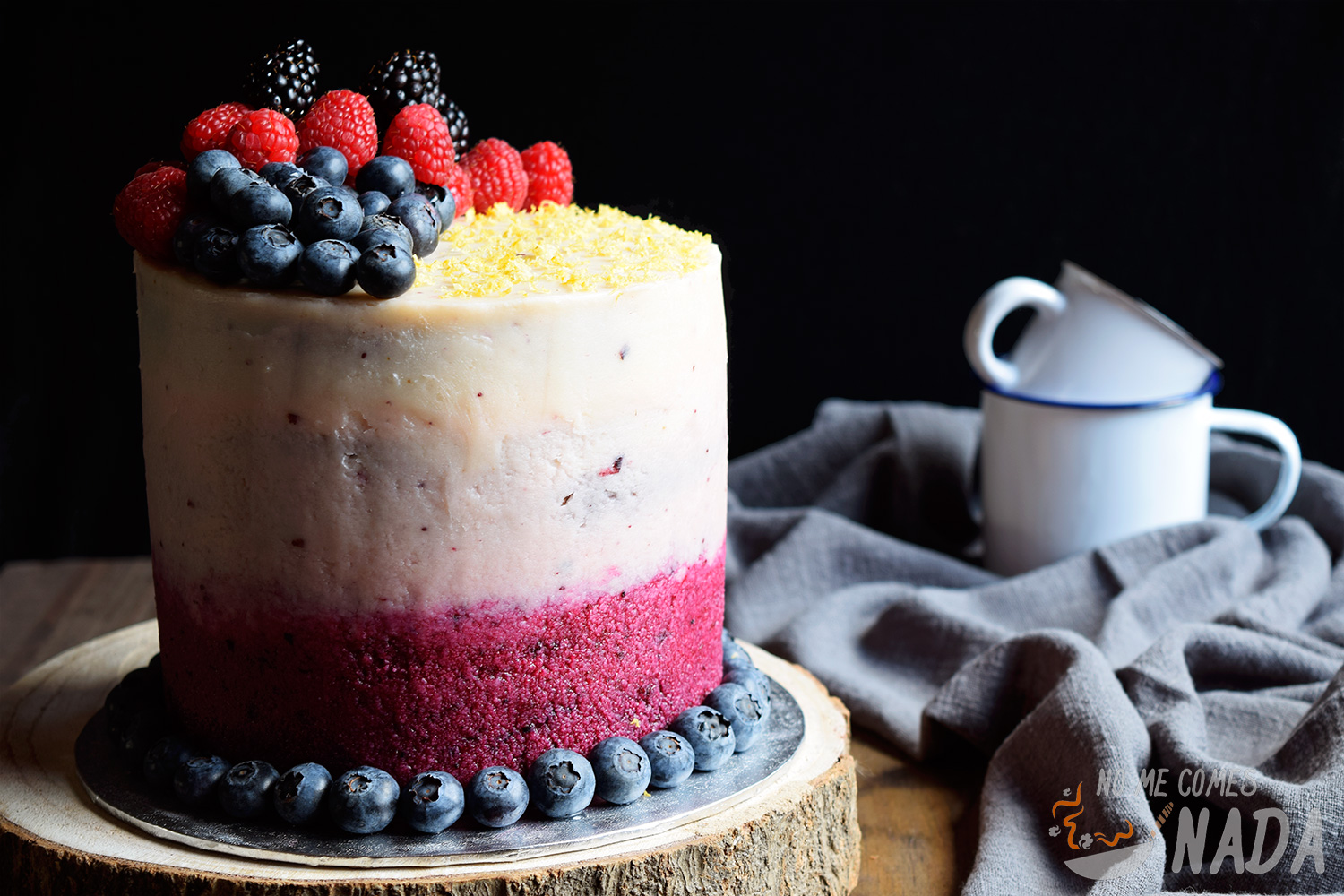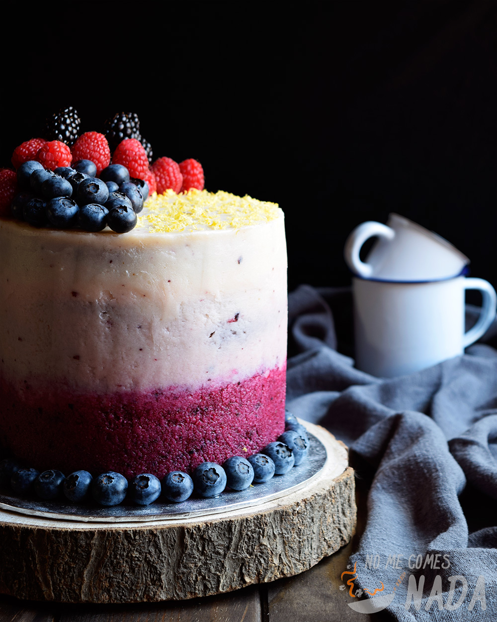 Una vez que la cobertura esté acabada, solo nos queda decorar nuestra tarta de limón y arándanos como más nos guste Yo me decanté por unos frutos rojos y ralladura de limón.