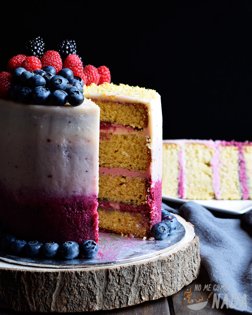 Este año quería subir el listón y complicar un poco la decoración de la tarta. Después de darle mil vueltas, me decanté por preparar una tarta degradada (conocida como ombre cake). He de confesaros que el resultado es peor del esperado porque tuve problemas técnicos con la buttercream jajajaja. Me quedé corto de cantidad y tuve que rehacer, perdiendo un poco las tonalidades finales y quedando un degradado en 2 tonalidades (o casi) más que en 3 como pensaba. Pero no pasa nada, estoy muy satisfecho con el resultado porque ya os digo que mis habilidades reposteras dejan mucho que desear y conseguir esta tarta de limón y arándanos es un reto para mi