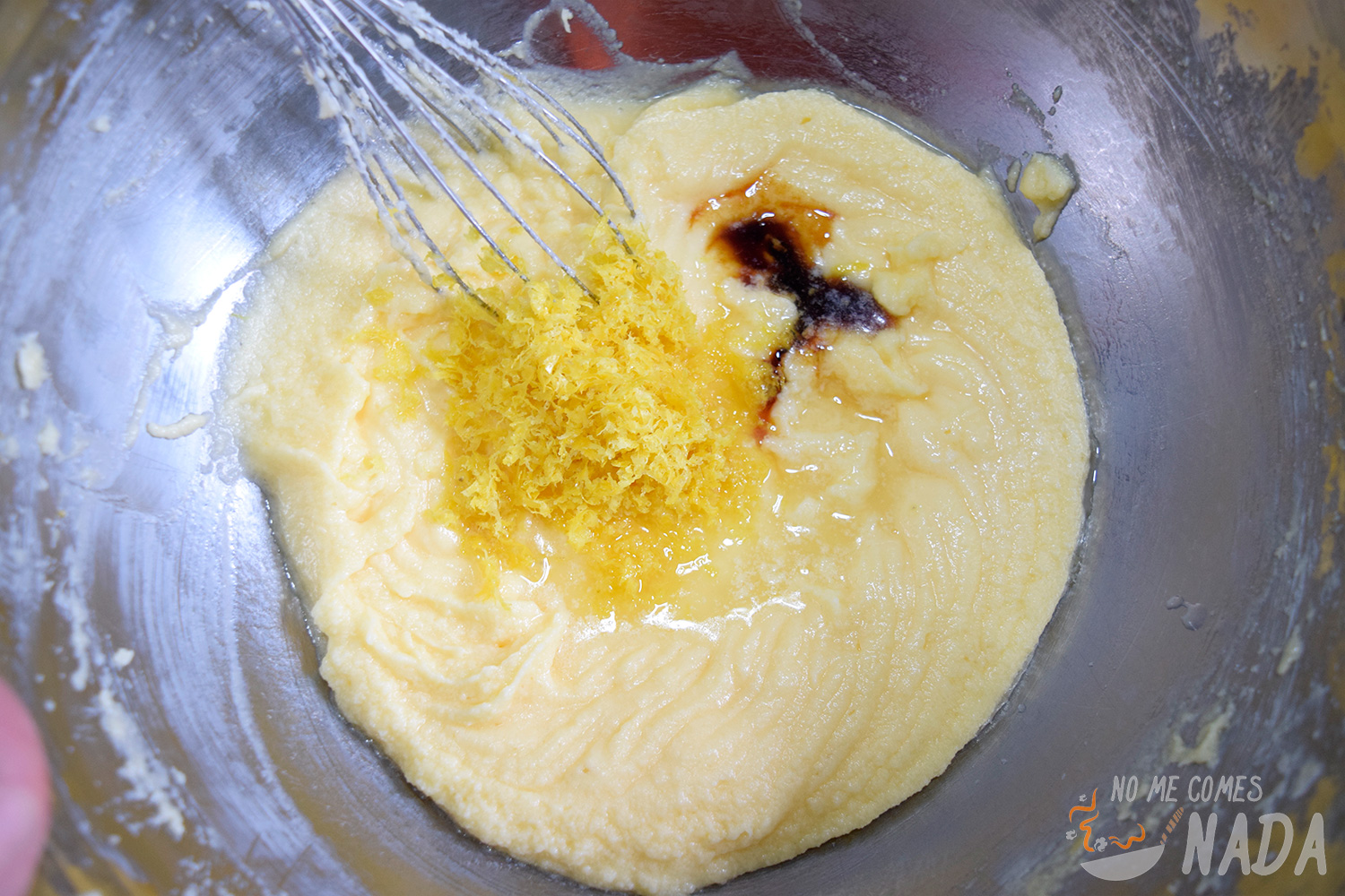 A continuación, iremos añadiendo los huevos uno a uno, batiendo cada vez que agreguemos uno hasta que esté totalmente integrado en la masa. Por último, echaremos la esencia de vainilla y el zumo y la ralladura de limón, volviendo a batir hasta que esté todo bien mezclado.