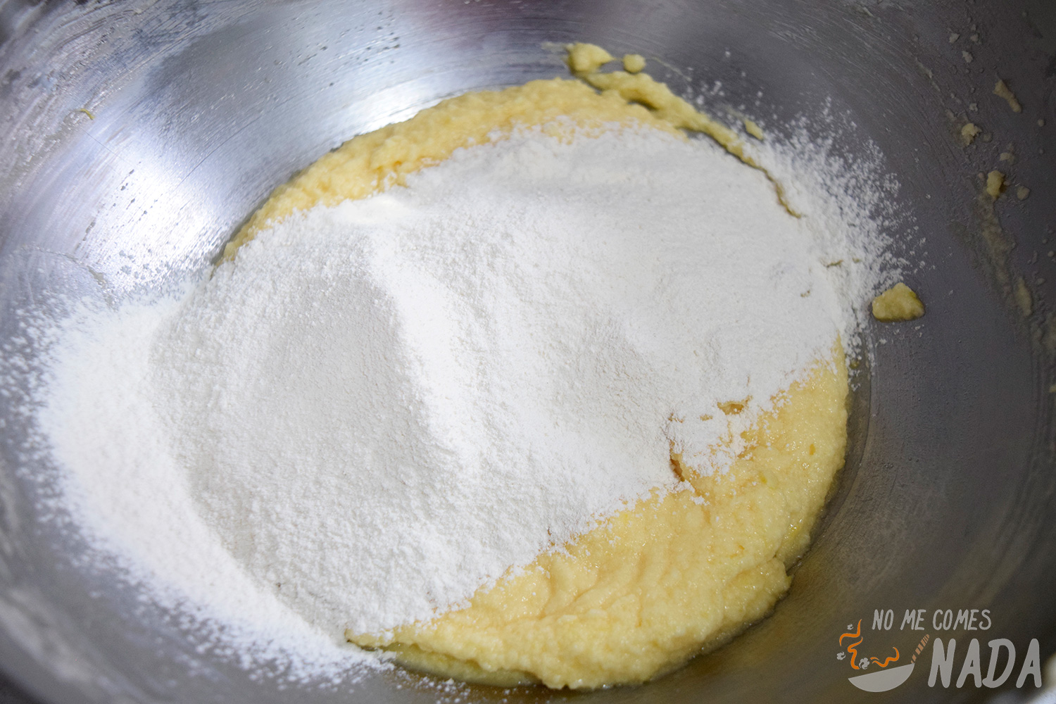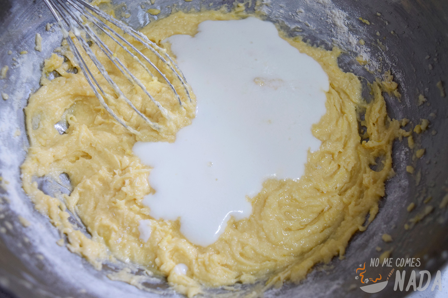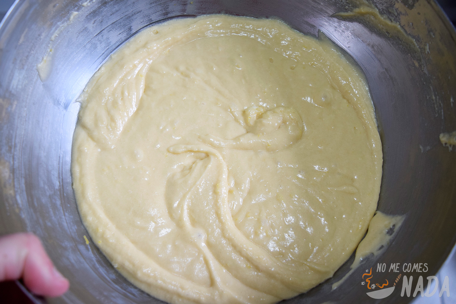 Para ello lo haremos en 5 tandas de la siguiente manera: harina, buttermilk, harina, buttermilk y harina (ya lo hice de esta manera en el bundt cake de limón, jengibre y pimienta). Cada vez que añadamos una tanda, como siempre, nos tocará batir hasta que esté totalmente integrada en la masa.