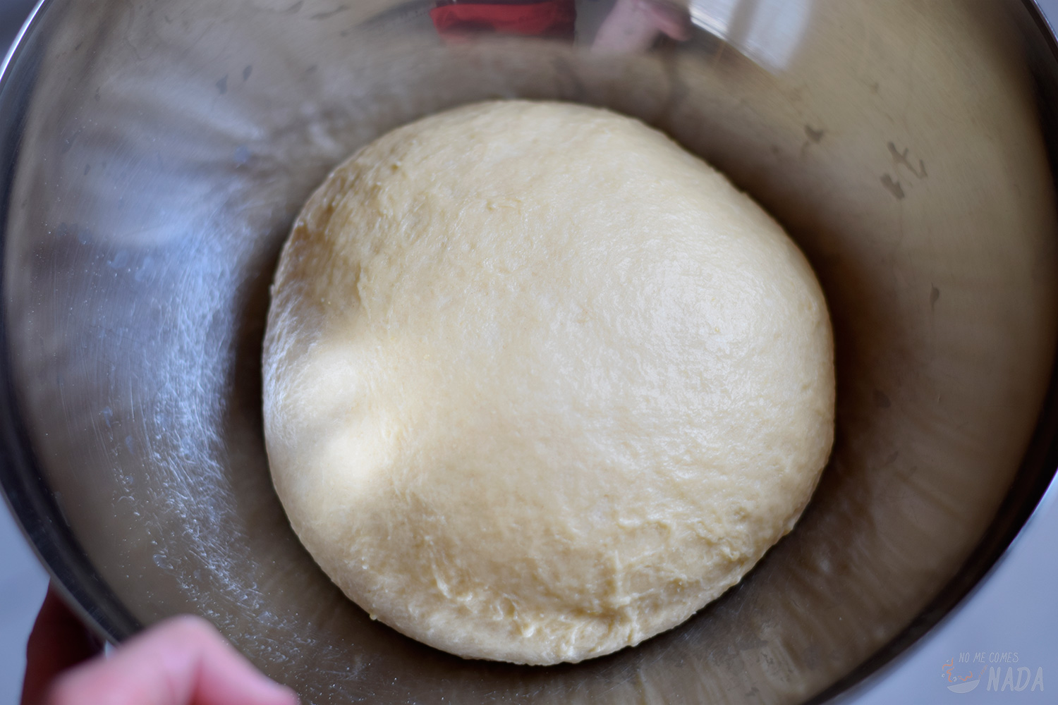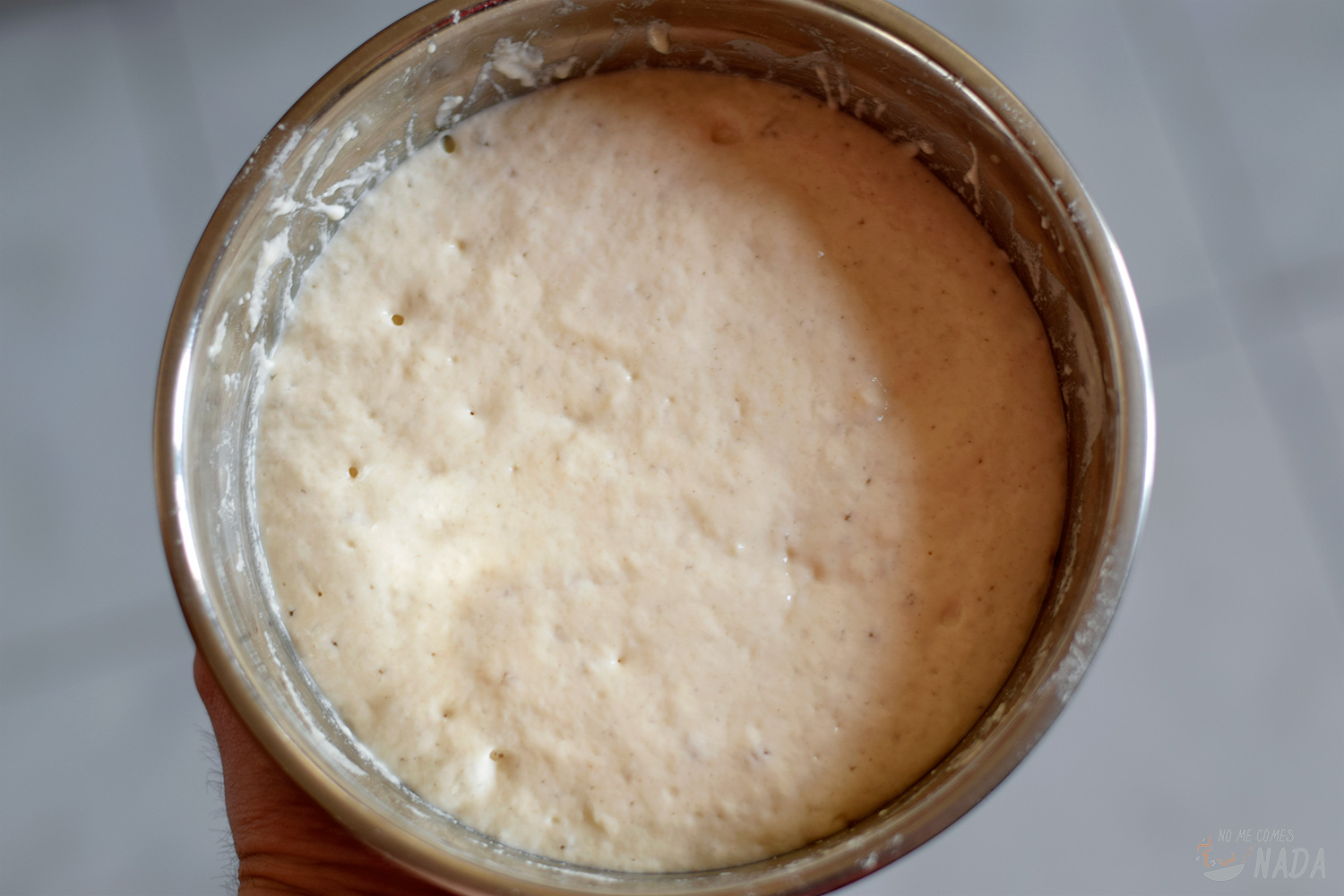 Ponemos la masa en un bol, la tapamos y dejamos que fermente hasta que doble su tamaño. Dependiendo de la temperatura ambiente, tardará más o menos tiempo. En mi caso estuvo casi unas 3 horas.