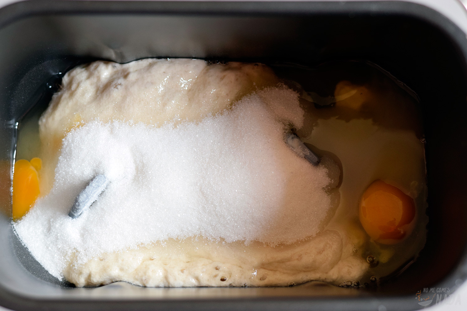 Cuando tengamos el prefermento listo, mezclamos todos los ingredientes excepto la mantequilla y amasamos hasta obtener una masa homogénea. Si tenéis robot de cocina, amasadora, panificadora… os podéis ayudar de ella porque os facilitará bastante la labor.