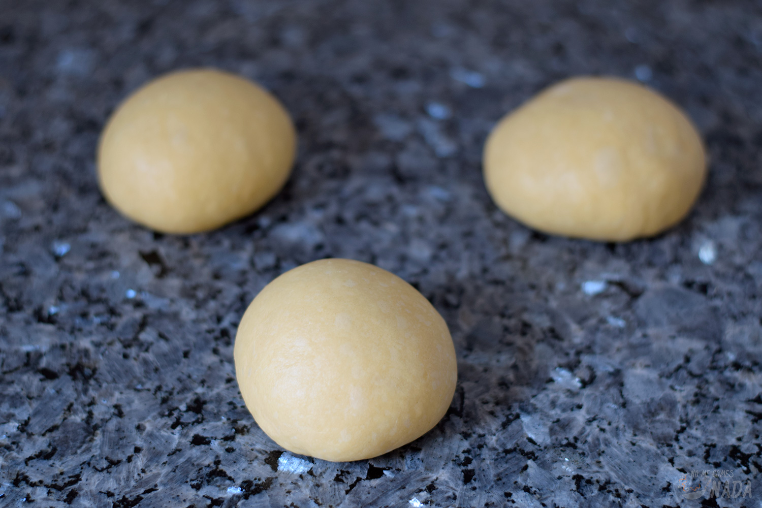Una vez la masa haya doblado su volumen, la volcamos sobre la encimera y la amasamos ligeramente para quitarle el aire (desgasificamos la masa). Dividimos la masa en 6 porciones iguales y boleamos cada una de ellas.