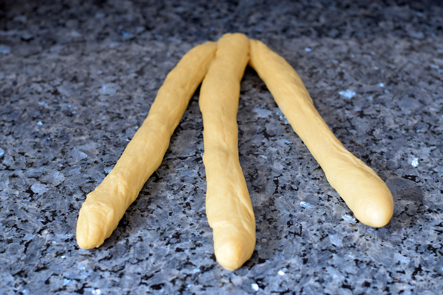 Utilizaremos 3 bolas para hacer la trenza que dará forma a la alfilada. Hacemos “churros” con cada una de las bolas, que tengan un largo de unos 40 cm. Unimos los 3 churros/cabos en un extremo y trenzamos al estilo normal de una trenza de 3 cabos, es decir, llevamos el cabo izquierdo al centro pasándolo por encima del que estaba en el centro. Repetimos alternando lados derecho e izquierdo hasta acabar la trenza.
