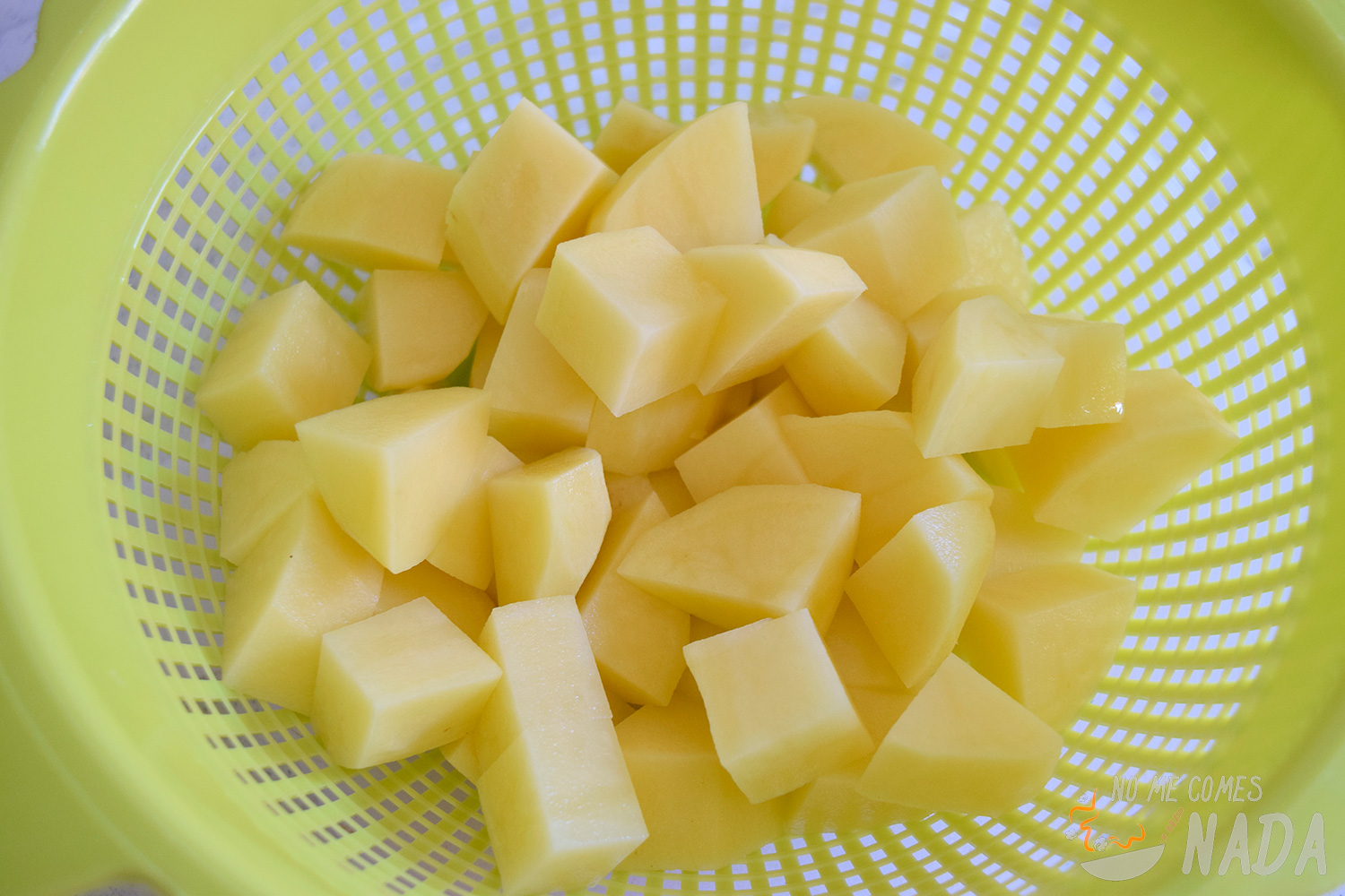 Pelamos y lavamos las patatas. Las secamos bien y las cortamos en cuadrados, en trozos de bocado, como si fuéramos a hacer unas bravas tradicionales.