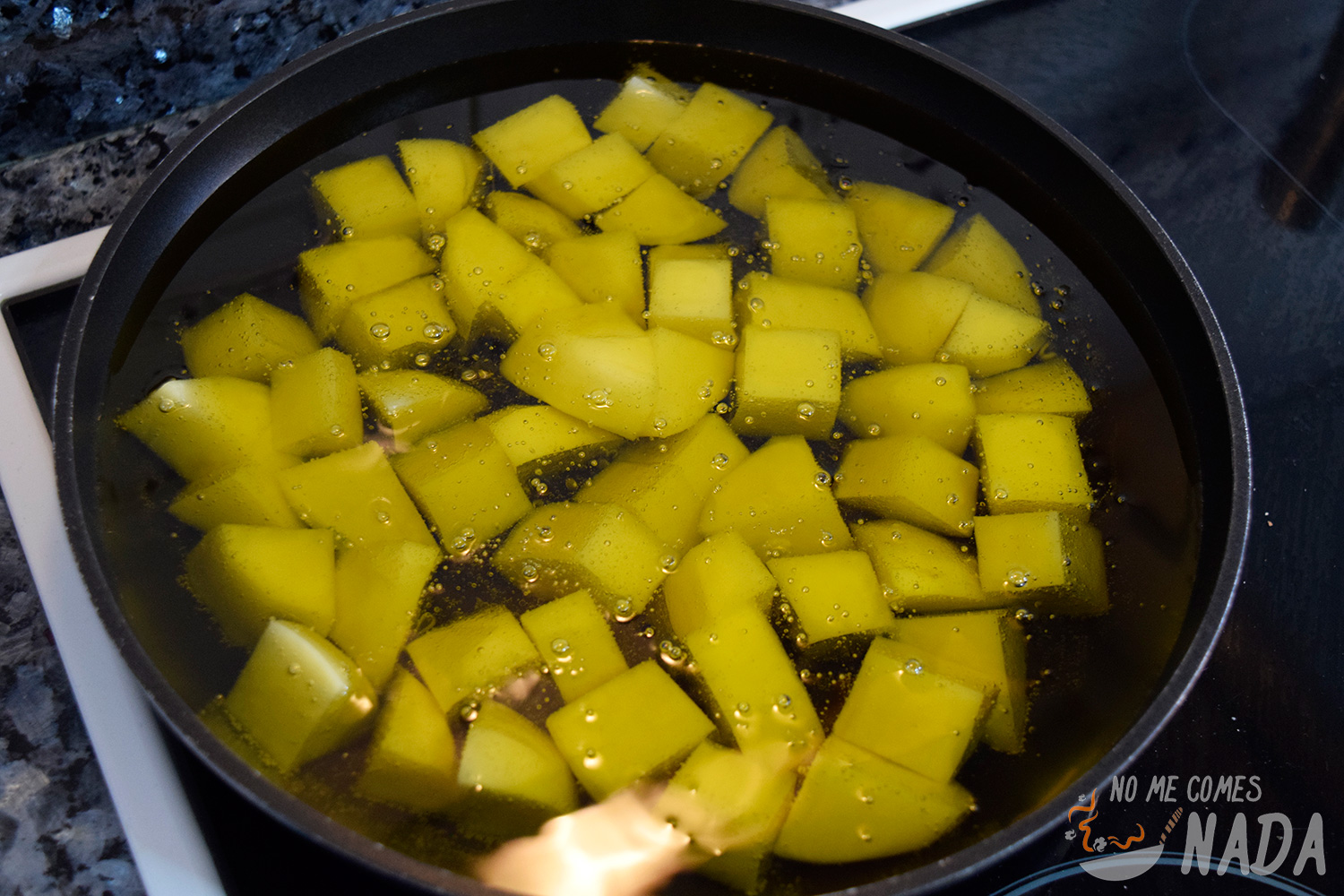 En una sartén honda echamos abundante aceite de oliva, queremos cubrir las patatas. Ponemos el fuego a media temperatura para que el aceite se caliente, pero sin llegar a coger demasiada temperatura (si empieza a echar humo, os habéis pasado). Echamos las patatas y las dejamos que se vayan haciendo a fuego muy lento, es decir, dejamos confitar las patatas en el aceite. Con esto conseguiremos que se queden blandas por dentro sin freírse por fuera. Dependiendo de las patatas y el tamaño de los trozos, tardarán unos 15 minutos en estar listas. Basta con pincharlas con un cuchillo para comprobar si están blandas.