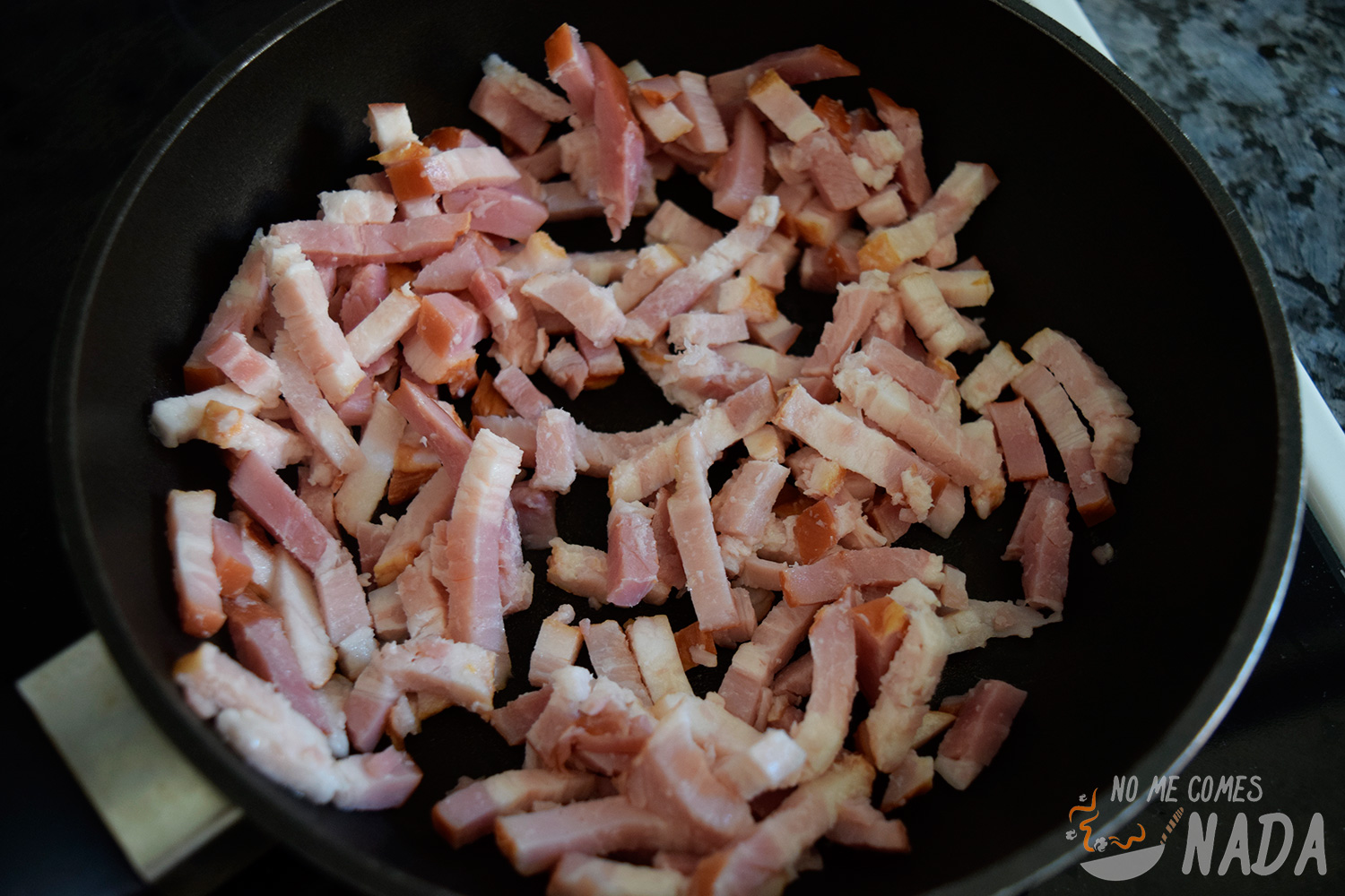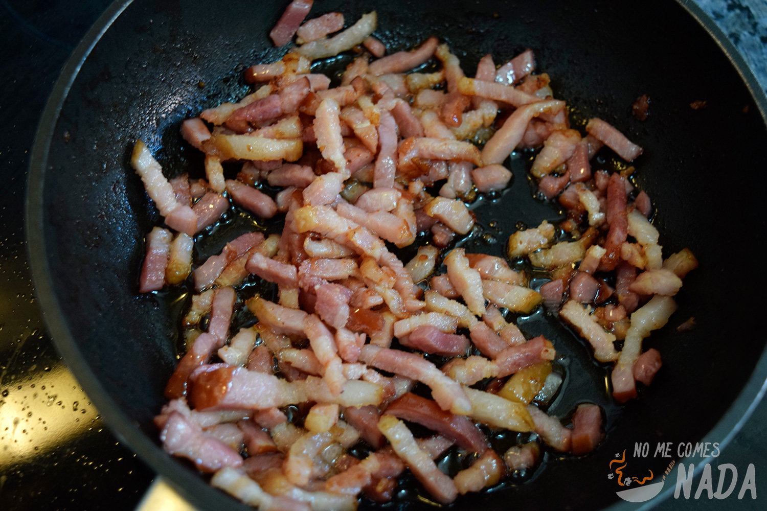 Mientras se confitan las patatas, podemos ir preparando el resto de ingredientes. Básicamente, en otra sartén echamos el bacon (sin aceite) y dejamos que se haga un poco a fuego medio. No necesitamos dorarlo demasiado porque luego en el horno se terminará de poner crujiente. Rallamos también el queso y reservamos.
