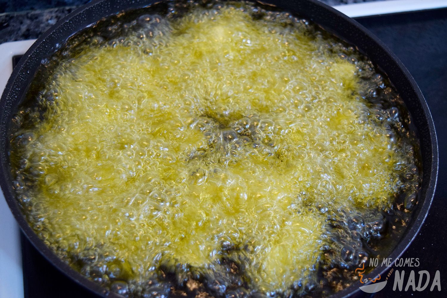 Como he dicho antes, un punto importante es freír bien las patatas porque son la base de esta receta. Además, al ser una mezcla entre las tradicionales patatas bravas y unas bacon cheese fries, vamos a freírlas al estilo de las primeras.