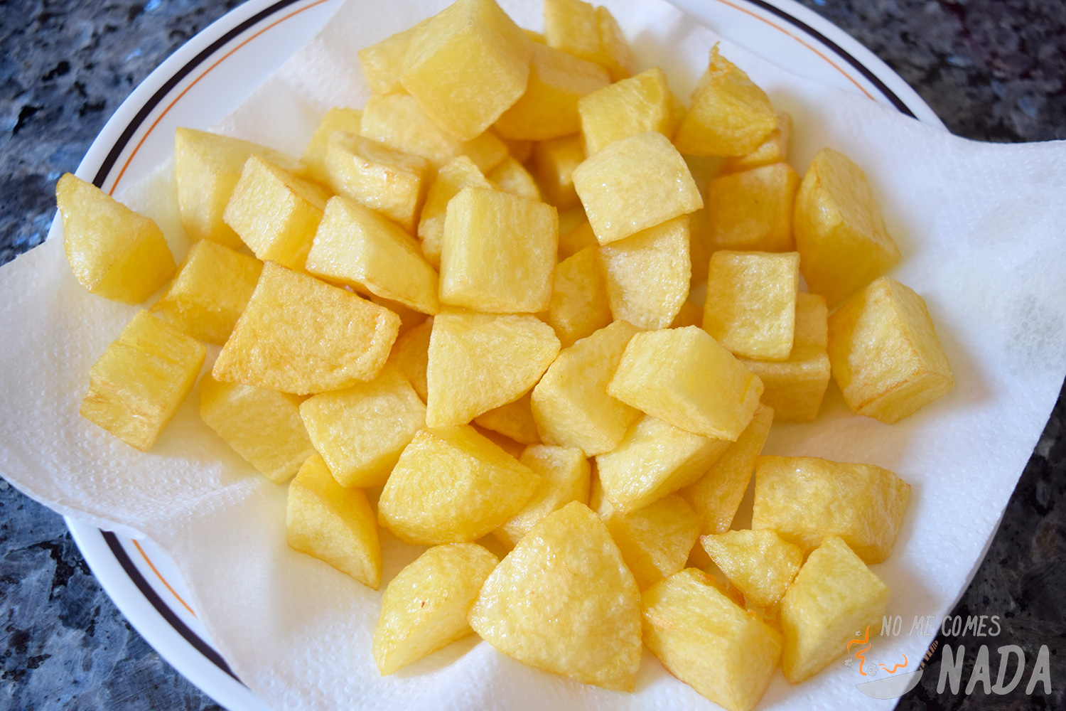Una vez que tengamos blandas las patatas, subimos el fuego muy alto para conseguir que se frían rápidamente, quedando muy crujientes por fuera, pero blandas por dentro. Retiramos cuando estén doradas y dejamos escurrir sobre papel de cocina para que suelten el exceso de aceite.