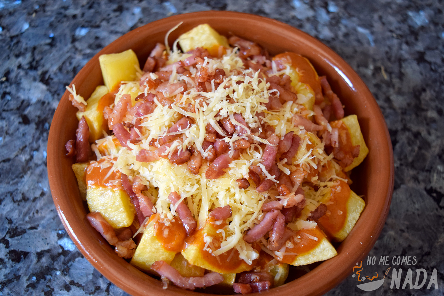 En un recipiente apto para horno, echamos las patatas y repartimos el resto de los ingredientes como más os guste, normalmente en el orden: salsa brava, bacon y cubriendo todo con abundante queso. En mi caso hice esto mismo, pero en 2 capas para que no se queden secas las patatas de abajo.