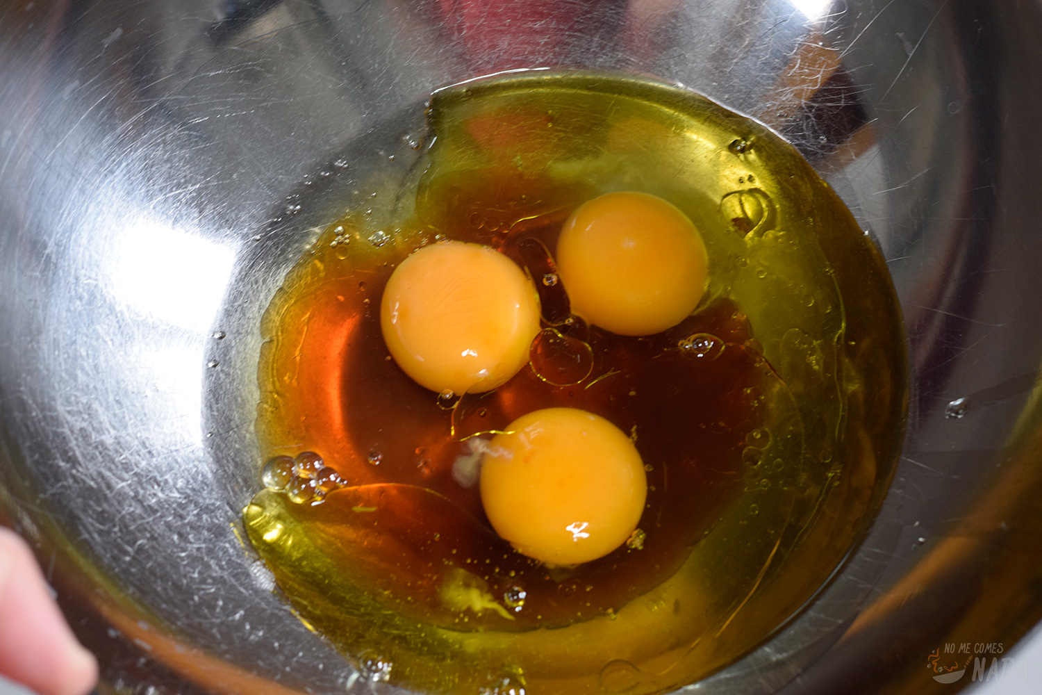 En un bol amplio, ponemos los huevos junto con el aceite y la miel. Batimos con las varillas hasta que esté todo integrado y los huevos hayan espumado un poco, para que la masa coja aire. Incorporamos el puré de castaña y volvemos a batir hasta integrar.