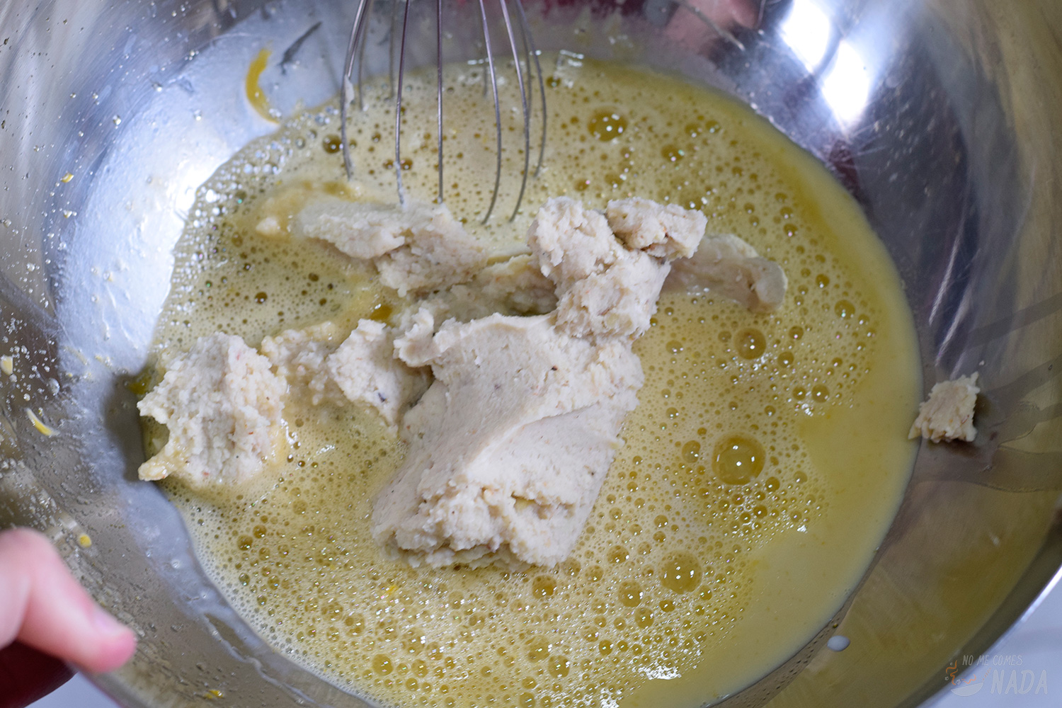 Para que la masa de nuestro bizcocho de castañas y chocolate esté lista, tendremos que darle la cremosidad adecuada (ahora estará bastante espesa). Basta con añadir leche poco a poco, mezclando cada vez, hasta dar con la textura típica de cualquier masa de bizcocho. En mi caso necesité añadir 125 ml de leche.