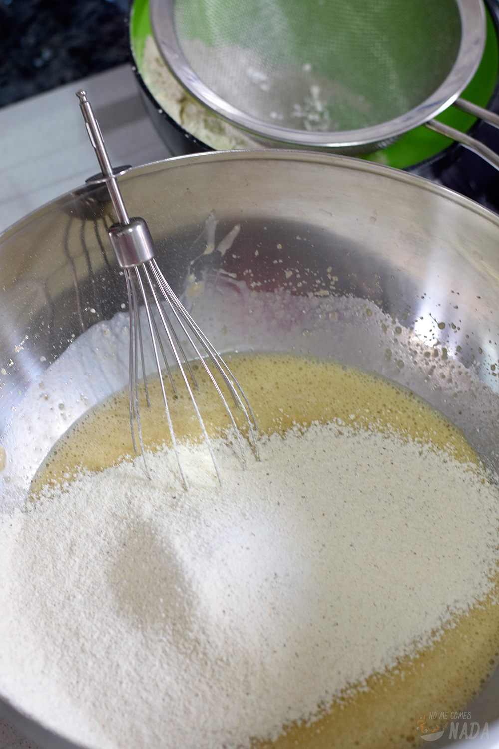 Añadimos la harina junto con la levadura, tamizándola previamente. La añadiremos en 3 veces al bol, mezclando hasta integrar cada vez que añadamos. Así conseguimos que la masa quede mejor y la harina no forme grumos.