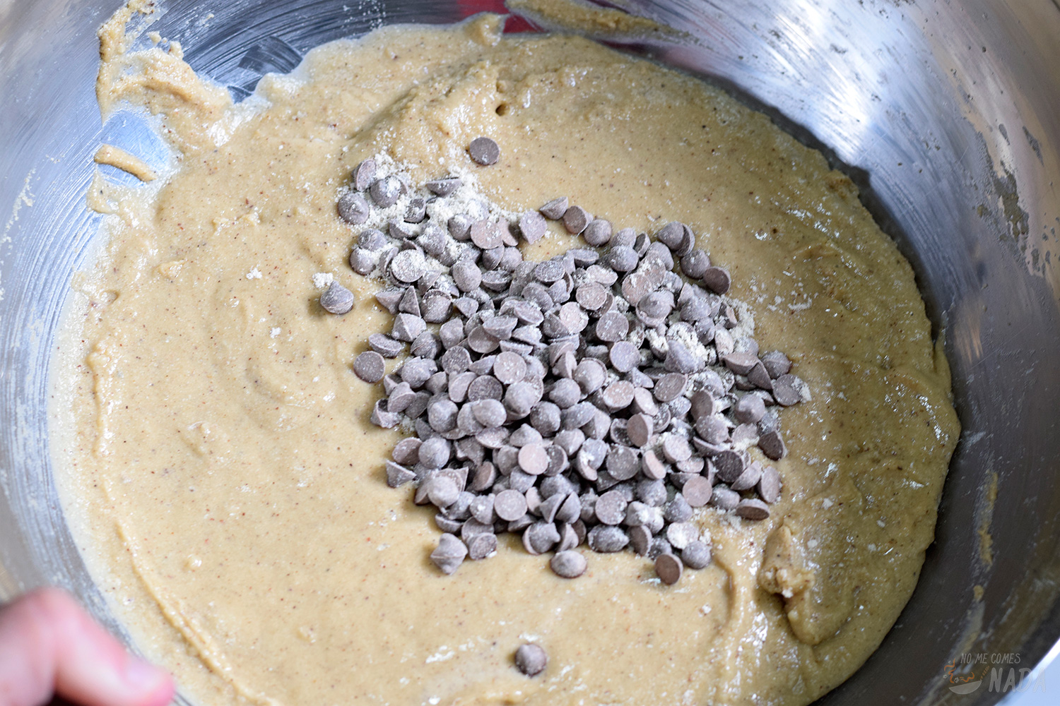 Por último, añadimos pepitas de chocolate y mezclamos ligeramente para que se repartan por la masa.