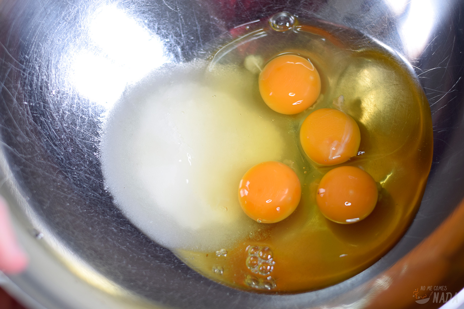 En un bol amplio ponemos el azúcar y los huevos y batimos hasta “blanquear”, es decir, que la mezcla coja volumen, esté aireada y empiece a tomar color blanquecino.