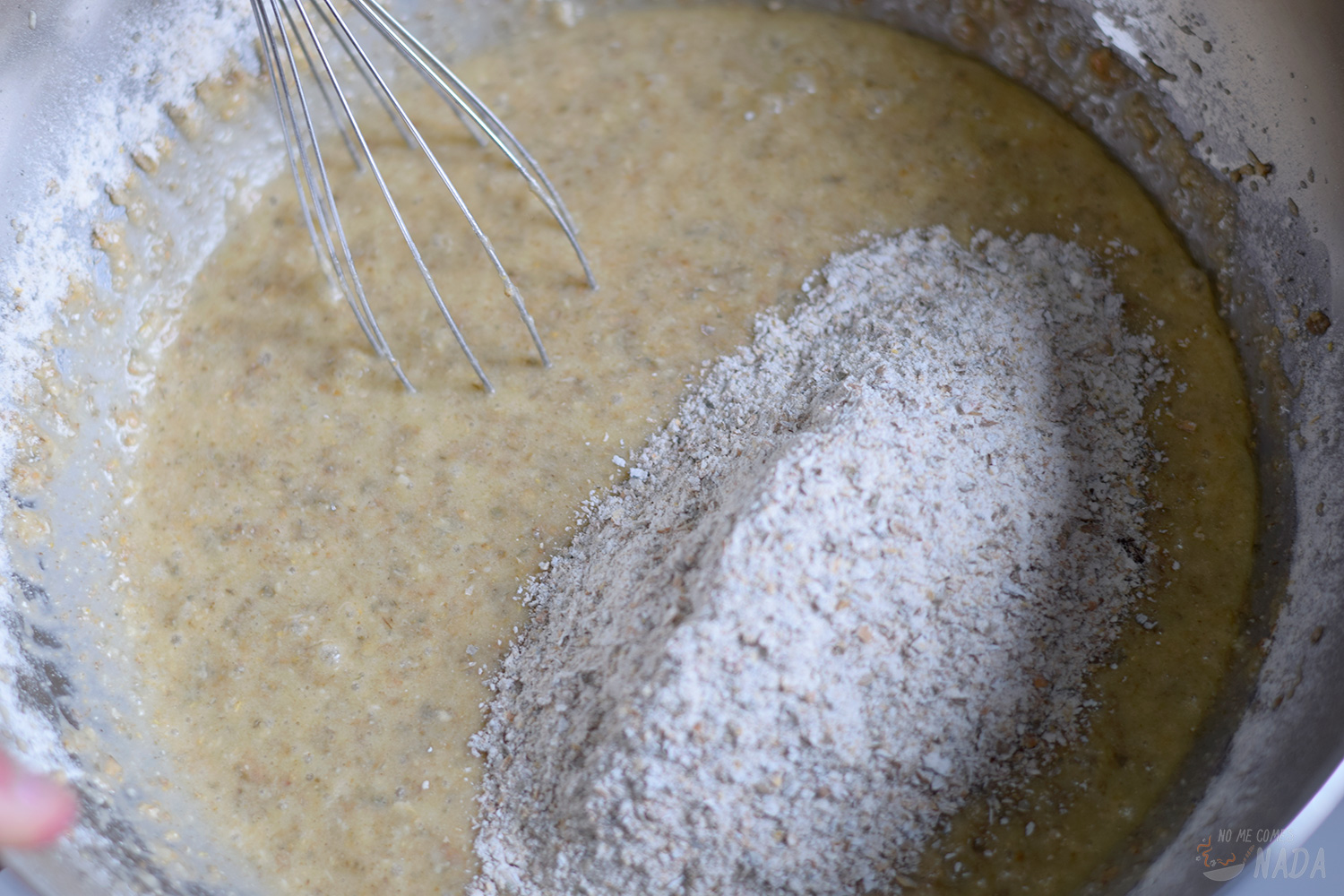 Mezclamos la harina con la levadura y agregamos al bol en 3 tandas. Tras cada tanda, volver a mezclar para que la harina se mezcle completamente con la masa. Normalmente os diría que la harina se añada tamizándola previamente, pero al ser una harina integral con mucho grano, yo no lo he hecho. Podéis tamizarla si queréis, pero tened en cuenta que se os va a quedar mucho grano en el colador, ¡¡no los tiréis!! Hay que echarlos también.