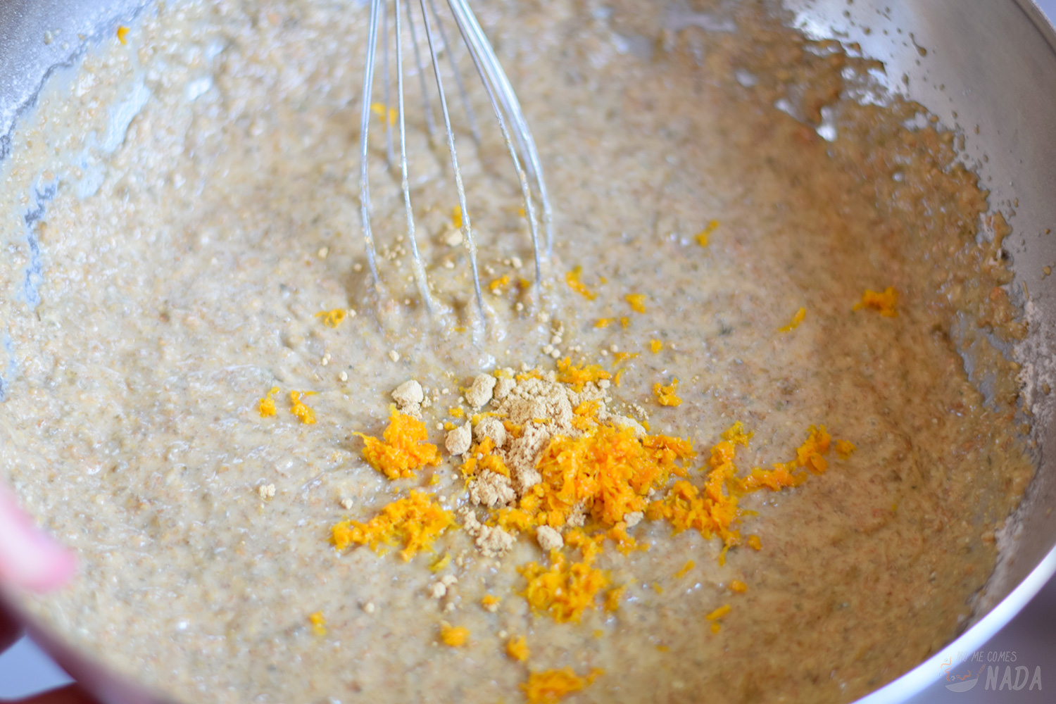 Por último, nos quedan añadir los extras para darle un toque de sabor al bizcocho de centeno integral. Yo me he decantado por una mezcla de jengibre y naranja que le viene de lujo (me encantan los cítricos en la repostería), pero podéis añadir lo que más os guste: almendra laminada, canela, limón, cardamomo, chocolate… Experimentad y contadme