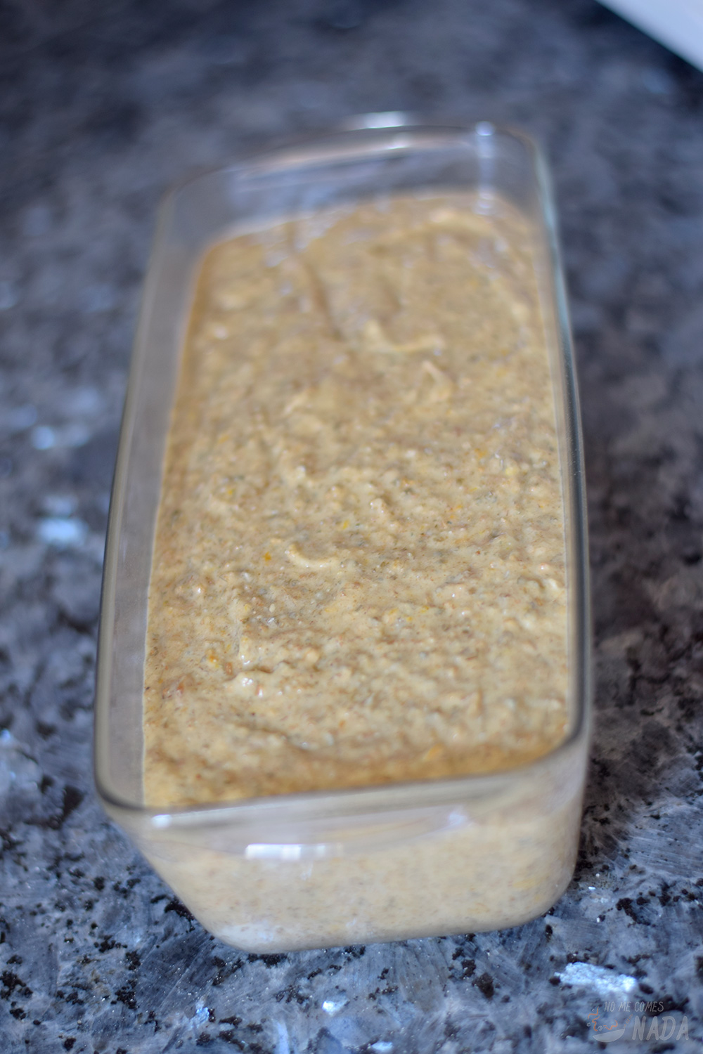 Una vez lista la masa de nuestro bizcocho de centeno integral solamente nos queda verterla en el molde que vayamos a usar para hornear. Yo he cogido un molde alargado de pyrex que he untado con spray desmoldante.