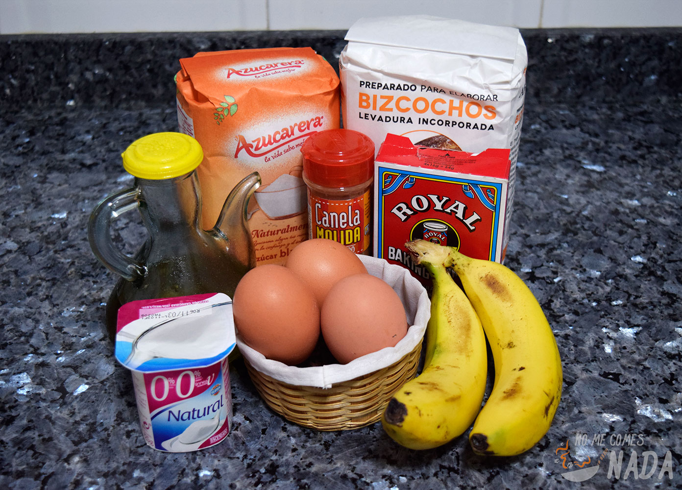 Una vez montadas, echamos las yemas, el yogur y el aceite, mezclando todo para que se quede bien integrado. Es importante remover después de incorporar cualquier ingrediente para que vaya formando una mezcla homogénea. A continuación añadimos el azúcar y los plátanos machacados.