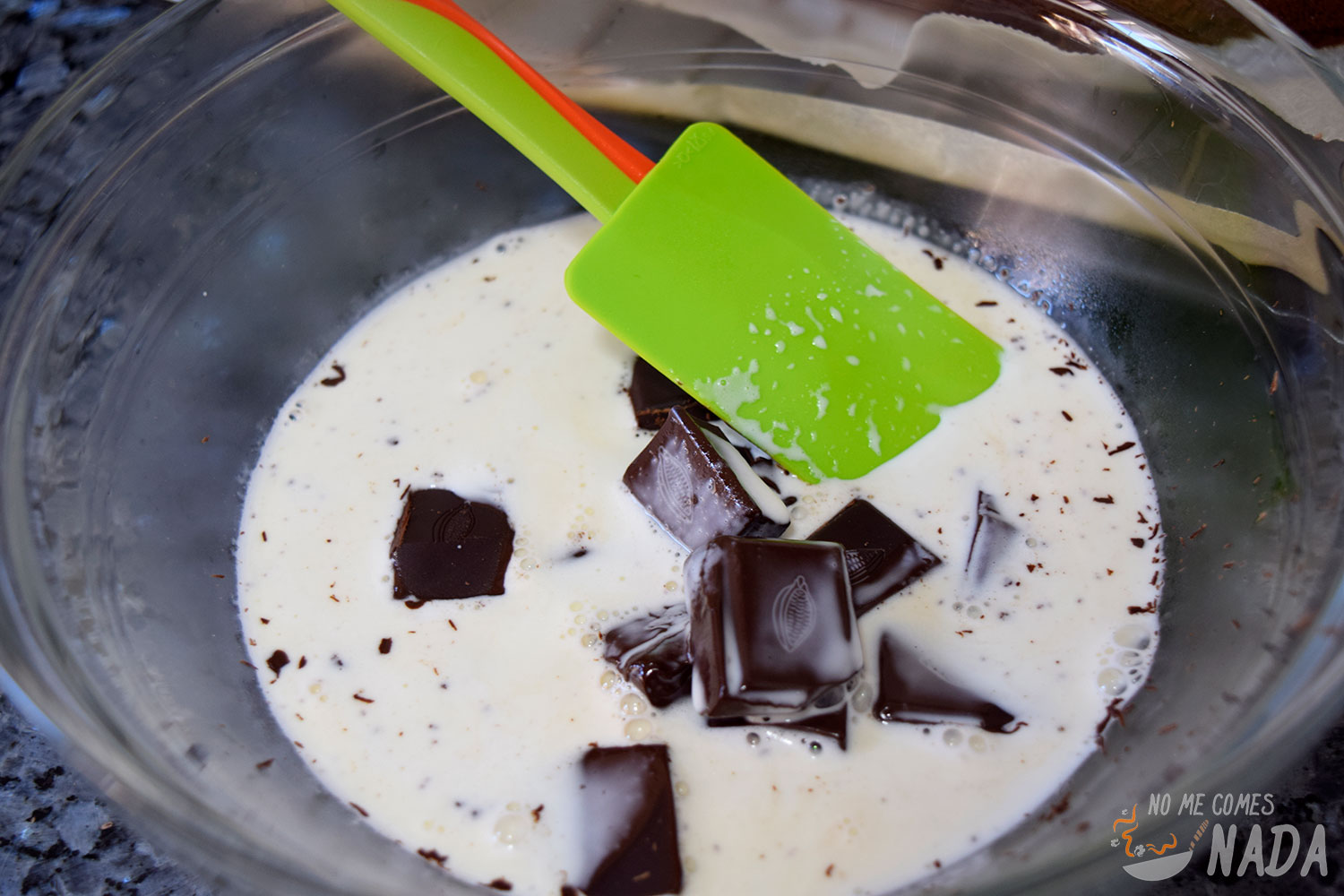 Con el bizcocho ya frío, pasamos a preparar la cobertura de chocolate. Para ello troceamos el chocolate en un bol y calentamos la nata en un cazo. Cuando ésta empiece a hervir, retiramos del fuego y la vertemos sobre el chocolate troceado. Removemos hasta tener todo el chocolate disuelto en la nata. Ahora, echamos una cucharada de mantequilla, removemos hasta que esté totalmente disuelta y repetimos lo mismo con la segunda y tercera cucharada de mantequilla.