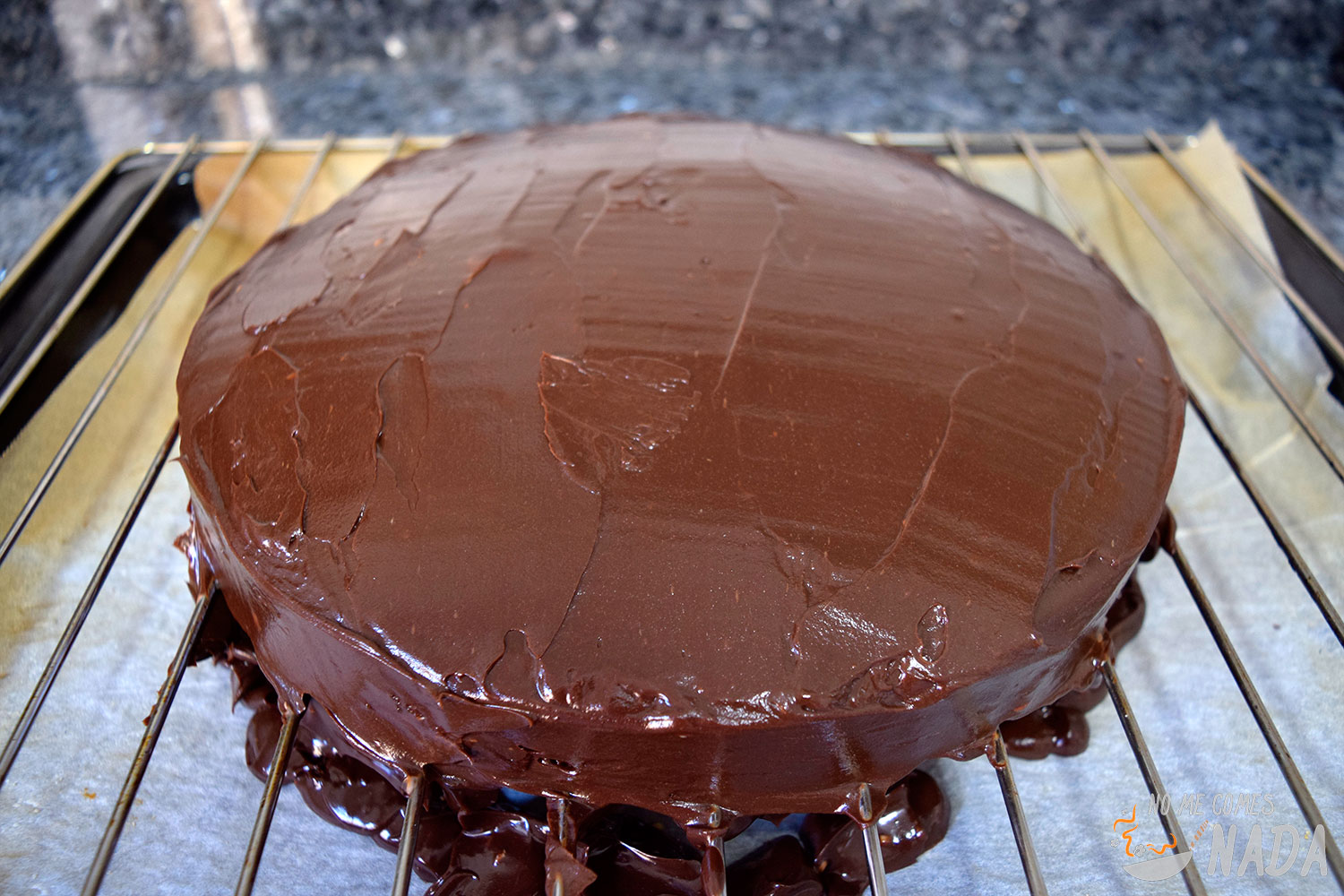 Ahora viene el “pero”. En mi caso el chocolate se enfrió demasiado y tomó una textura más densa de lo que debería, así que no fue tan fácil cubrir el bizcocho, teniendo que echar mano de la paleta para extender el chocolate, por lo que no quedó tan uniforme como me hubiera gustado.