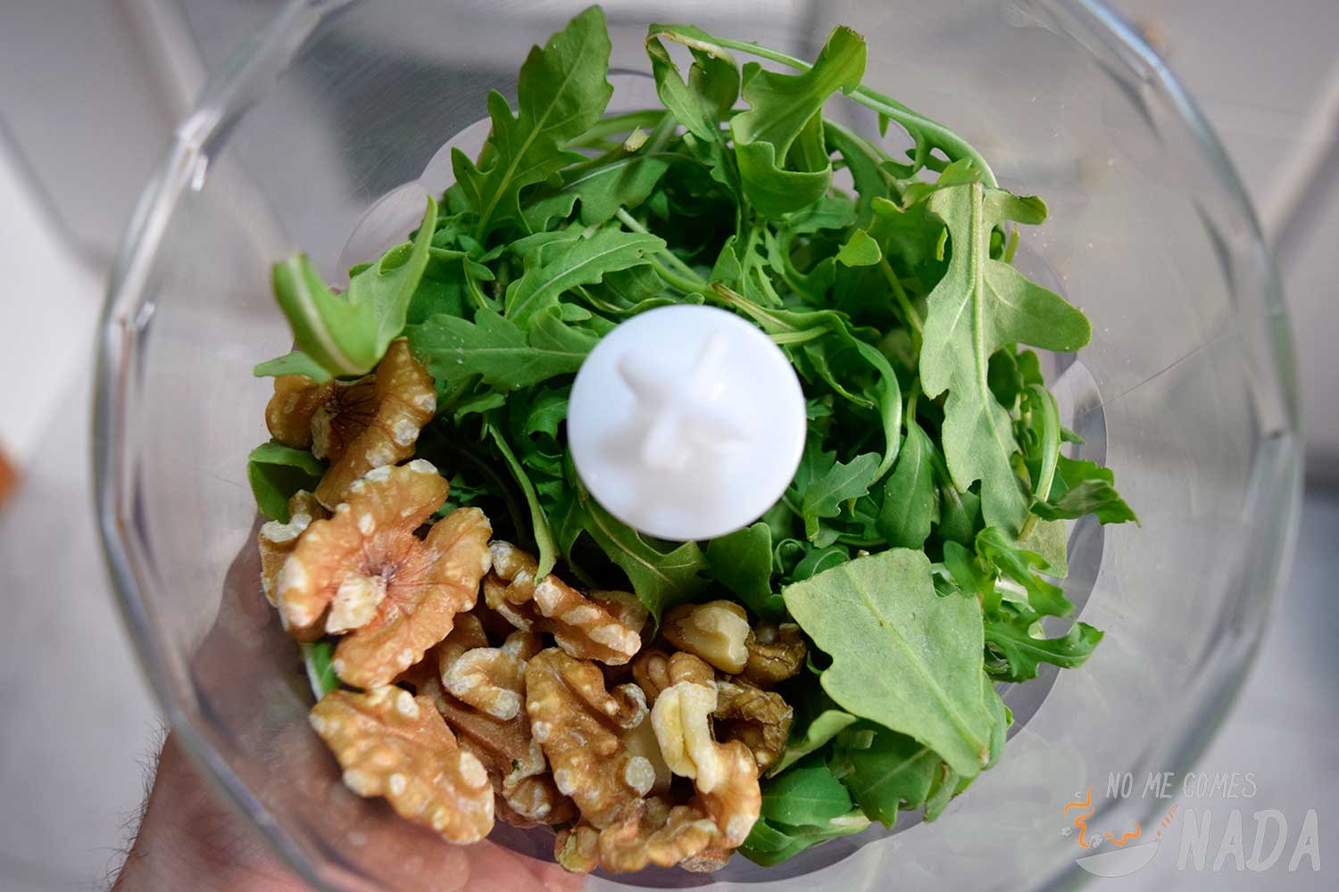 Empezamos colocando las nueces y la rúcula en el vaso de la picadora y trituramos un par de minutos. Añadimos el queso roquefort, el queso crema y la nata. Volvemos a triturar hasta que estén los ingredientes totalmente integrados y tengamos una crema homogénea.